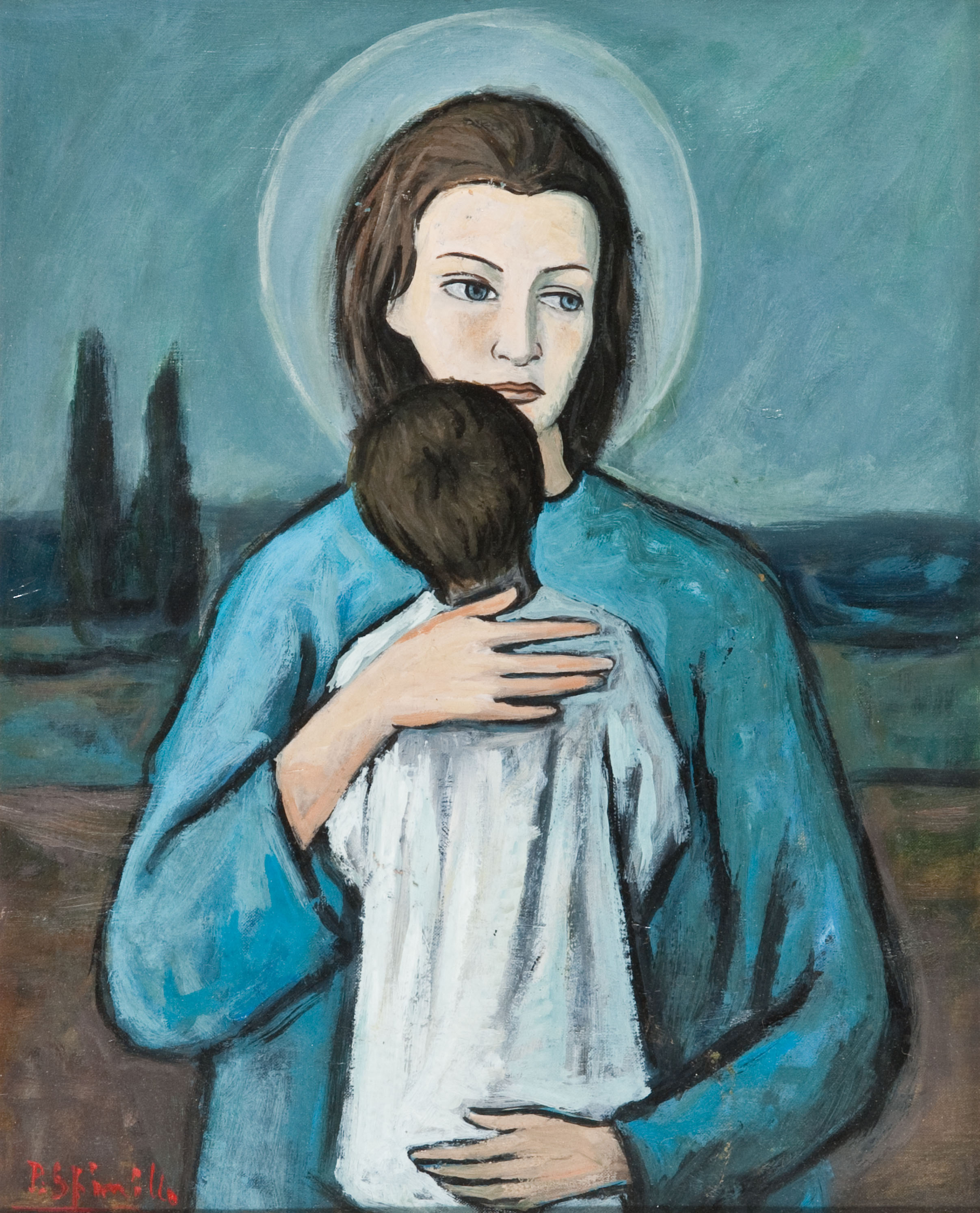 P. Angelico Spinillo Madonna con bambino, 1972 Olio su cartone telato, cm. 49,5x40 Firmato in basso a sinistra. Sul verso: firma e data; Etichetta "Bottega d'Arte", Livorno.