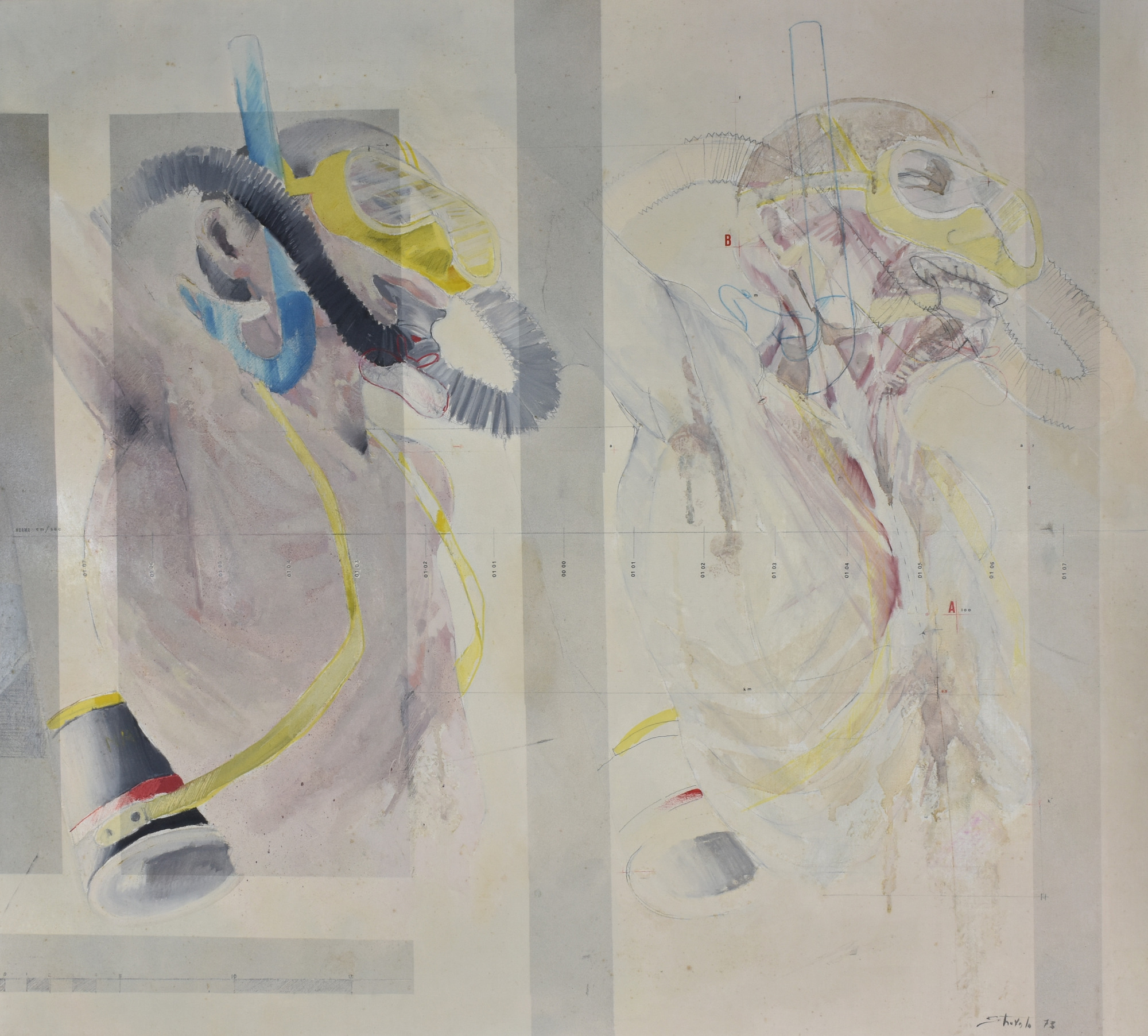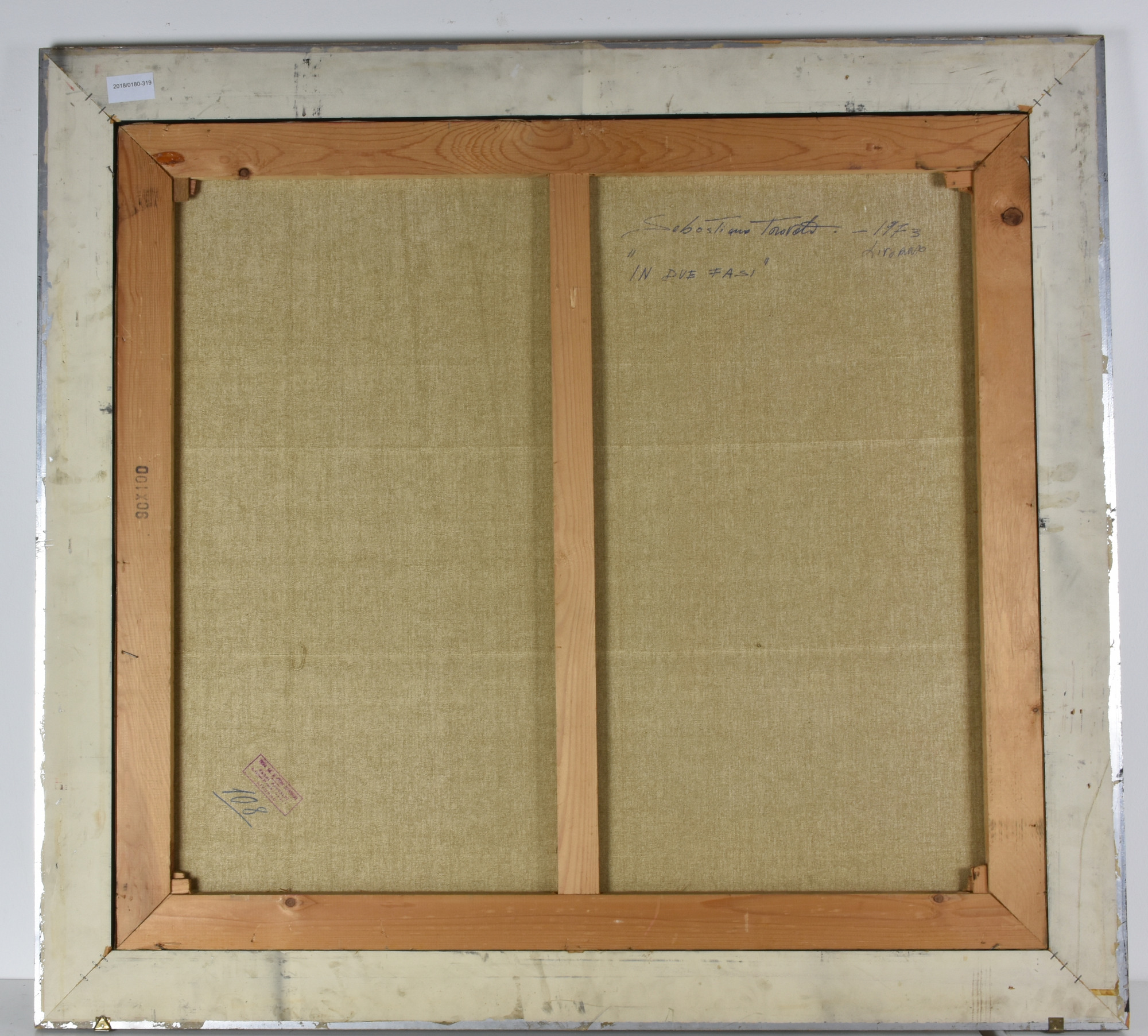 Sebastiano Trovato IN DUE FASI tecnica mista su tela, cm 90x100 sul fronte: firma e data al retro: firma, data e titolo eseguita nel 1973 L'opera presenta un piccolo taglio