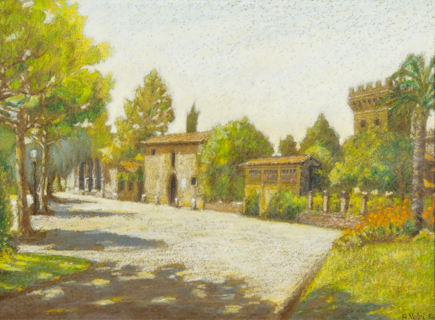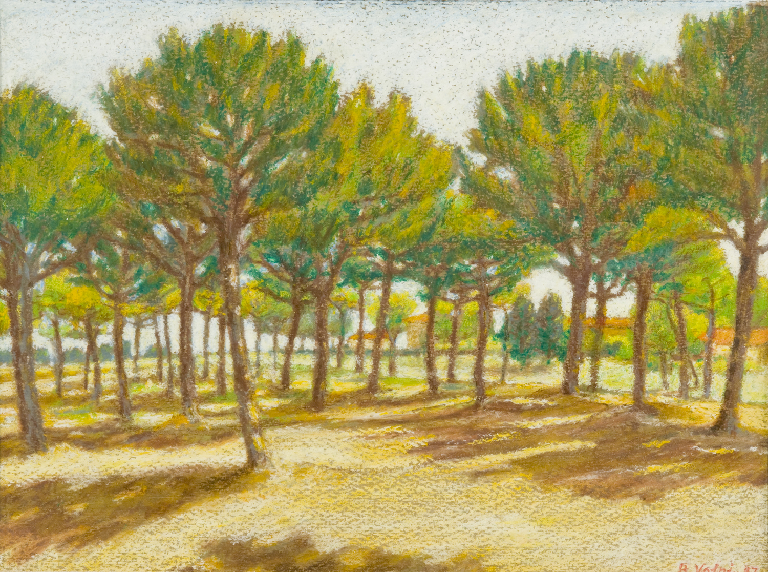 R. Volpi Lotto unico di due Opere - "Pineta di Montecatini", 1957, Pastelli su cartoncino, cm. 24x32, firma e data in basso a destra; - "Stabilimento Tamerici di Montecatini", 1956, Pastelli su cartoncino, cm. 22x31, firma e data in basso a destra.