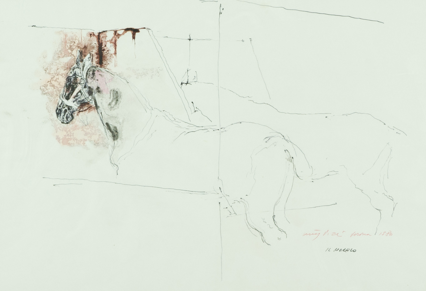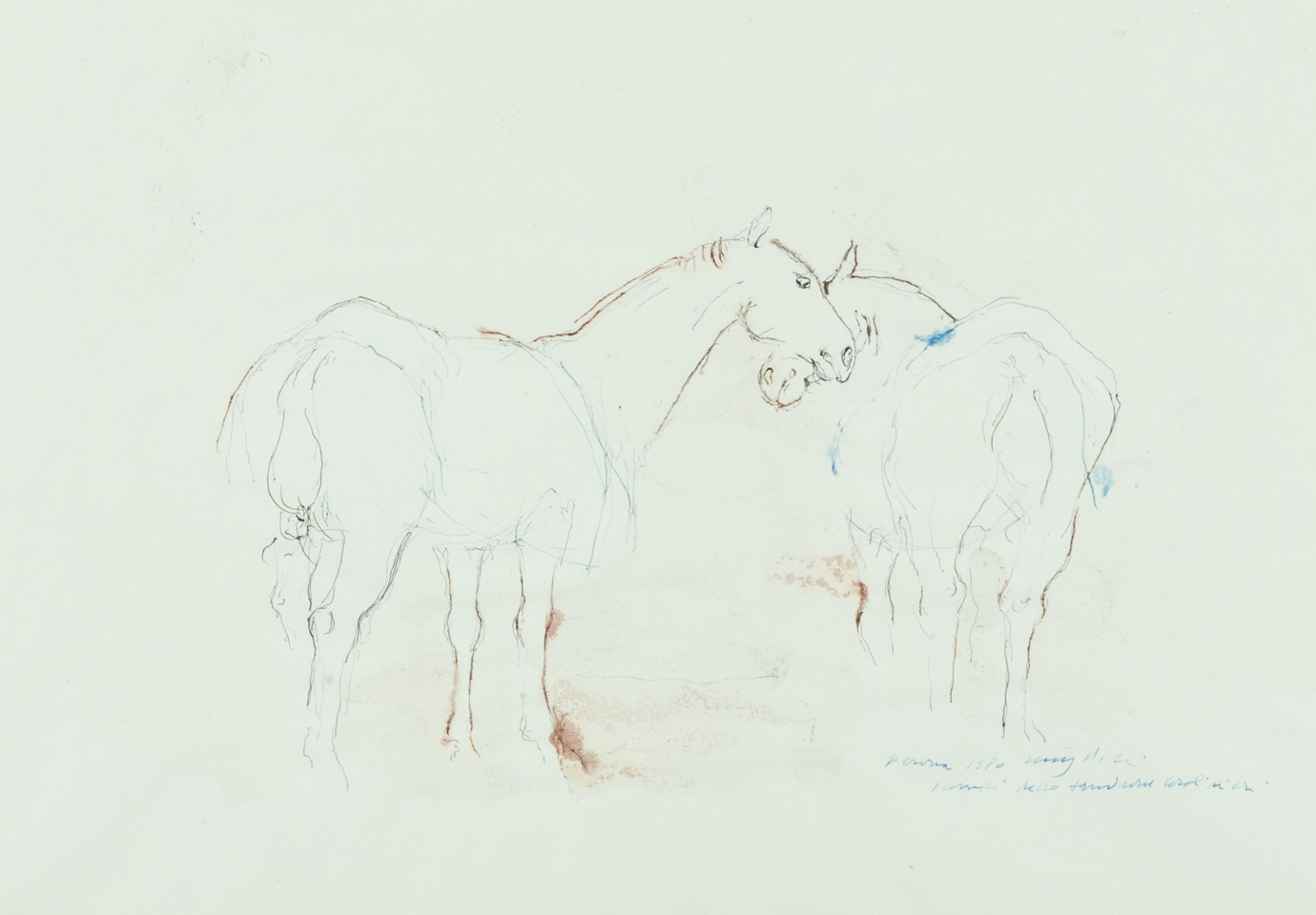 Walter Piacesi Lotto unico di due Opere - "Il morello", 1980, Tecnica mista su carta, cm. 33x47, firma, data e titolo in basso a destra; - "Cavalli", 1980, Tecnica mista su carta, cm. 33x47, firma, data e titolo in basso a destra.