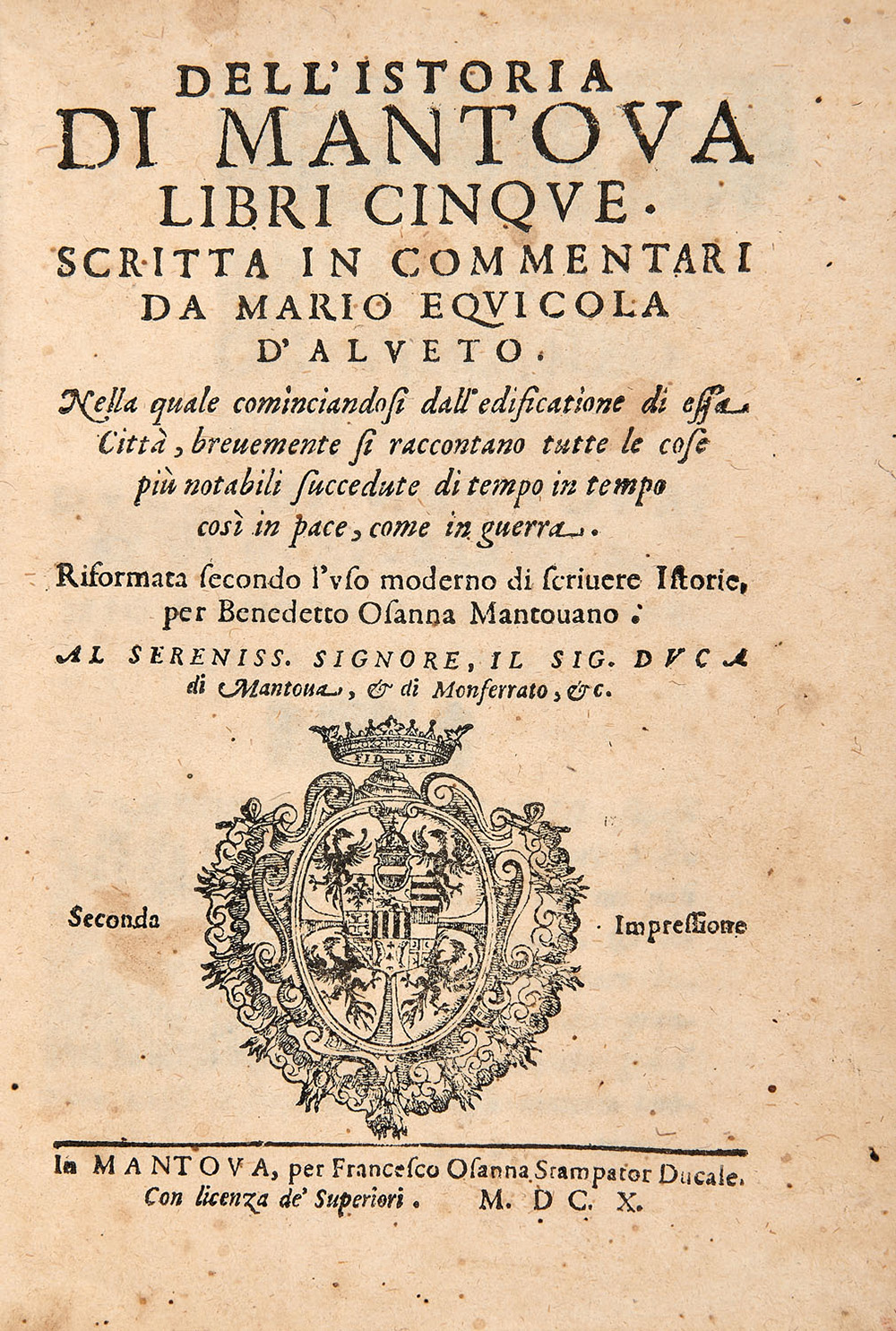 EQUICOLA, Mario (1470-1525) - Dell'istoria di Mantova. Mantova: Francesco Osanna, 1610.