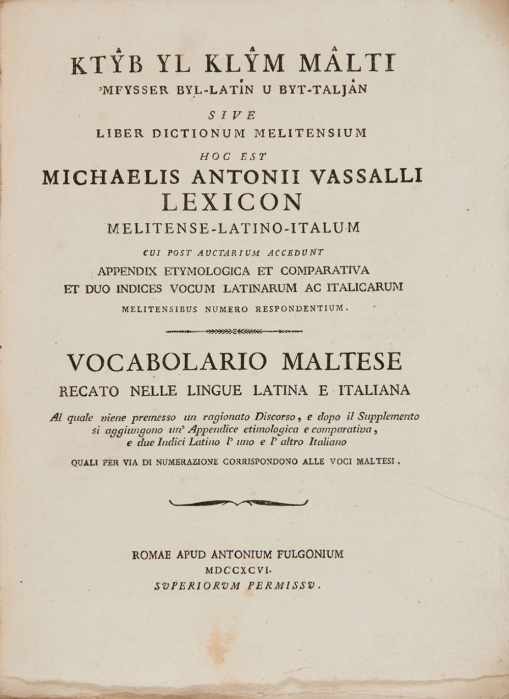 [MALTA] - VASSALLI, Mikiel Anton (1764-1829) - Vocabolario maltese recato nelle lingue latina e italiana. Roma: Antonium Fulgonium, 1796.