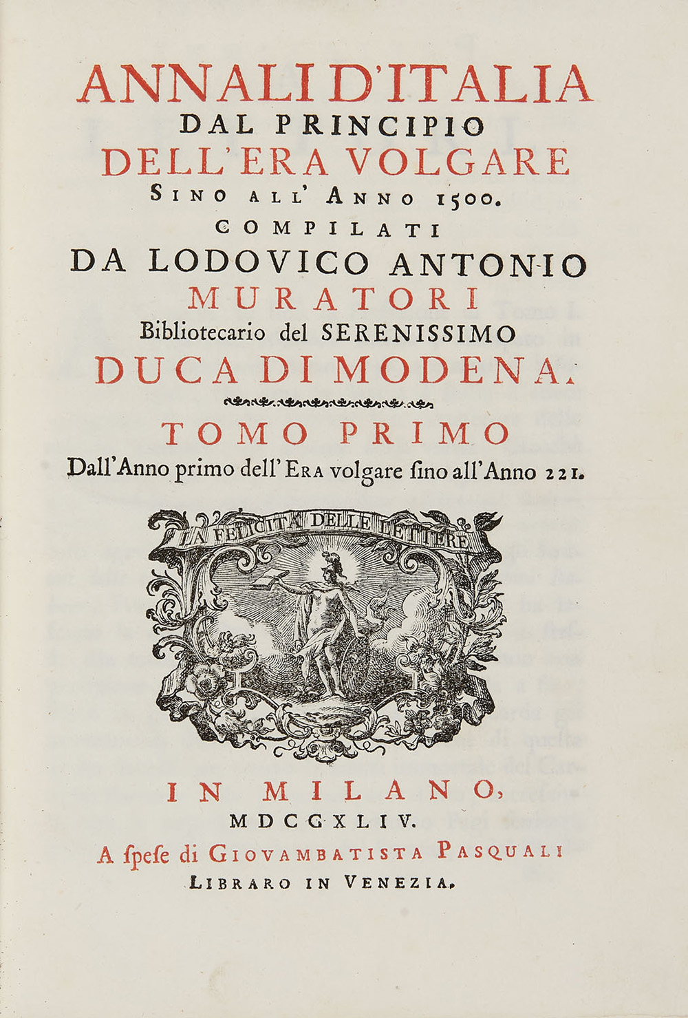 Buona copia della principale opera di Muratori che illustra la storia italiana dagli albori fino al 1749.