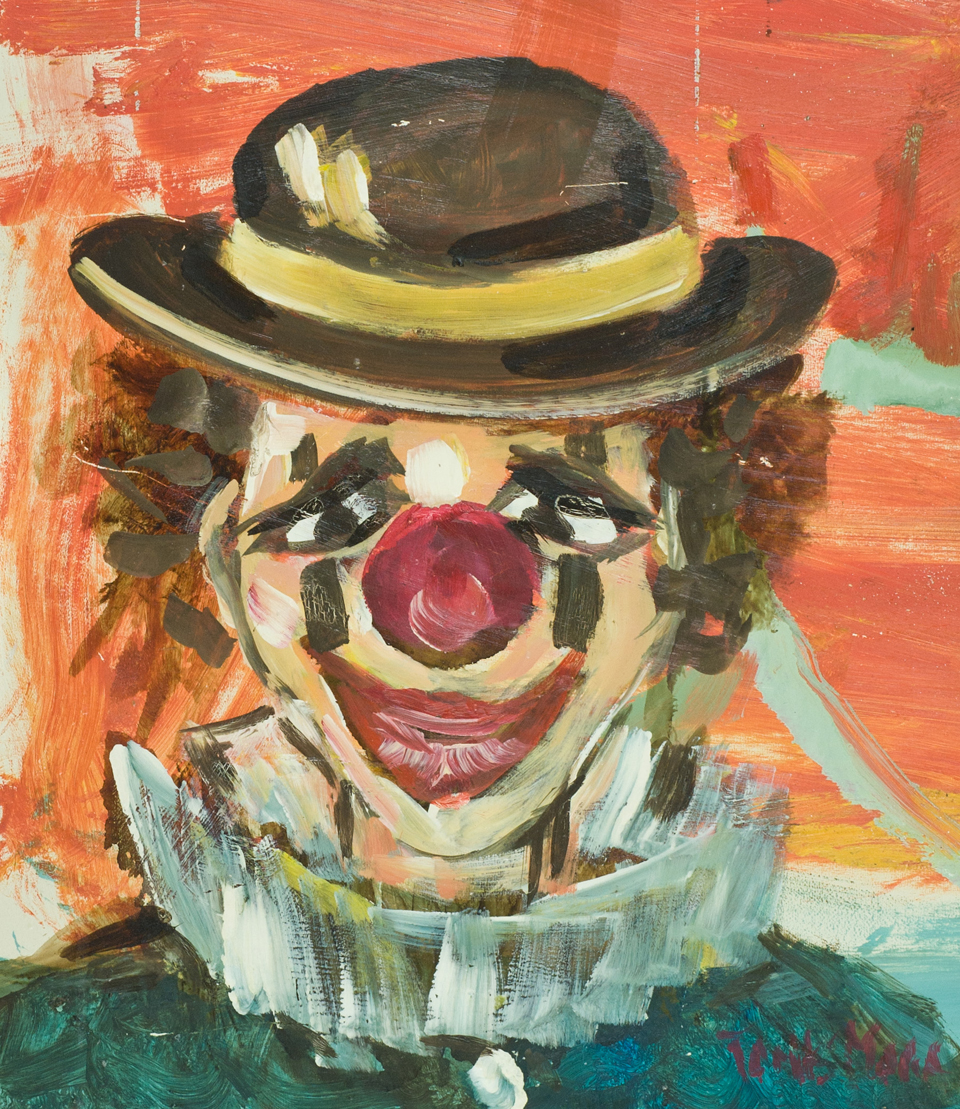Tony Mora Pagliaccio Olio su faesite, cm. 37x32 Firmato in basso a destra. Sul verso: etichetta di Autenticità dell'Artista.