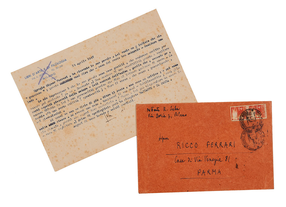 A typed letter dated 5 April 1947 and signed by Umberto Saba in which the author gives a gentle opinion about the poetry of the young Rocco Ferrari. Typescript (144 x 210mm) and envelope. (2)