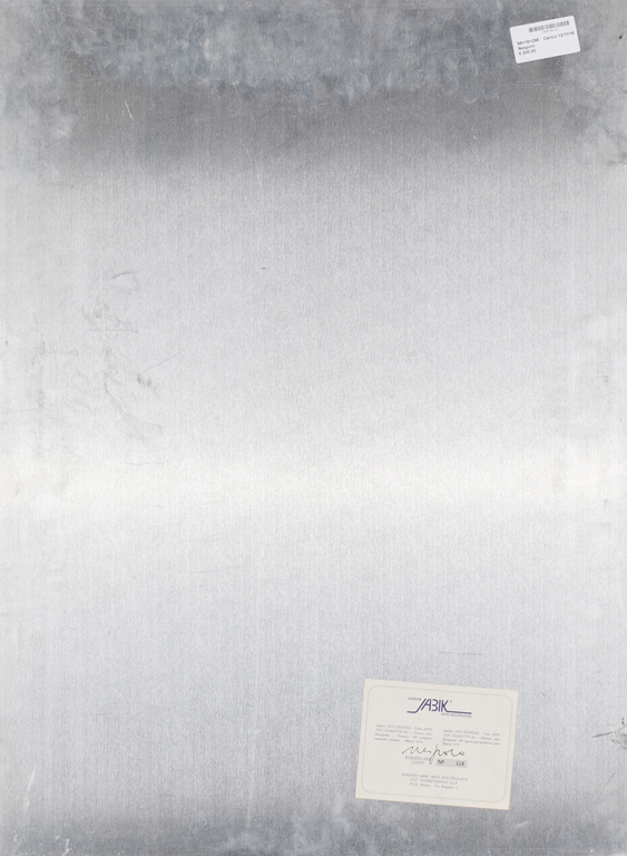 Etichetta delle Edizioni Jabik (MI) con caratteristiche tecniche, firma a biro dell'Artista e indicazione della tiratura (Esemplare 328/500)