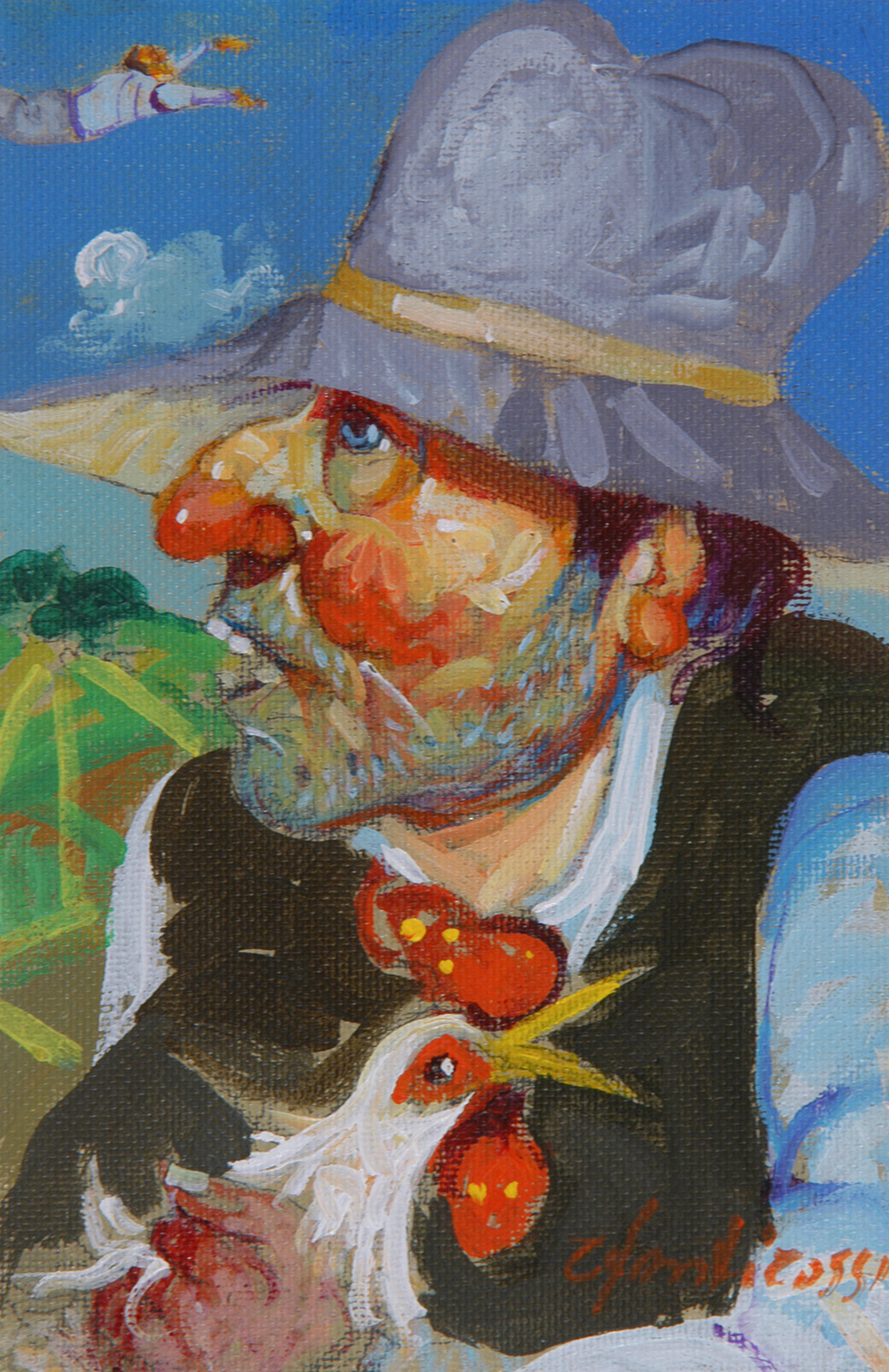 Roberto Fontirossi Pietro e la gallina Olio su cartoncino telato, cm. 15x10 Firmato in basso a destra. Sul verso: titolo e firma.