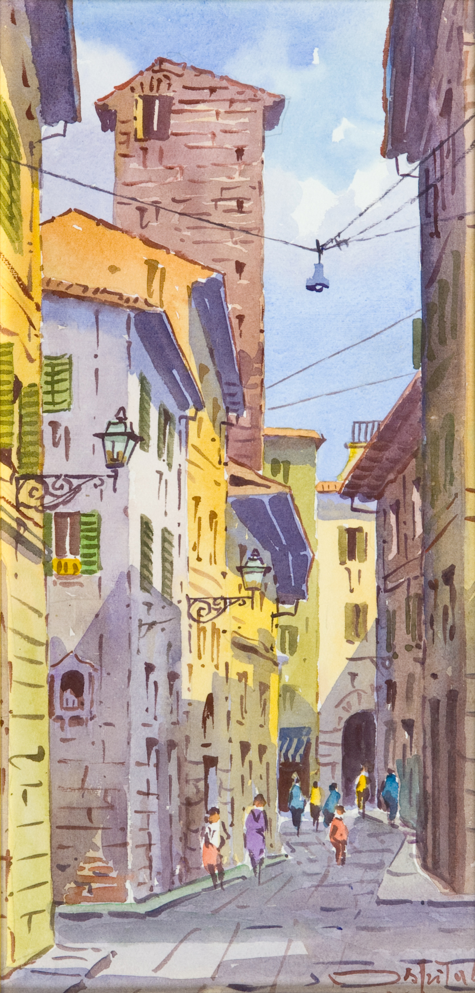 Giovanni Ospitali Scorcio di paese Acquerello su cartone, cm. 40x20 Firmato in basso a destra.