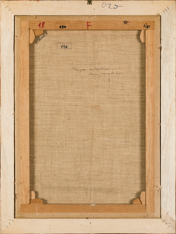 Timbro della Galleria Pace (MI) con relativo numero di repertorio al retro sulla tela e sul telaio