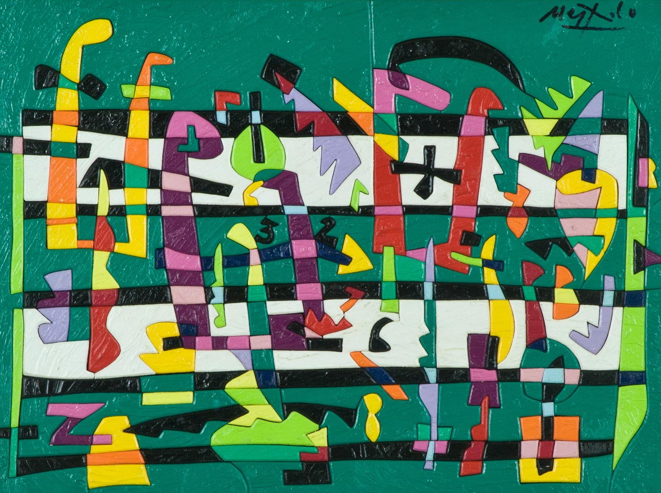 Ugo Nespolo Piccolo concerto Acrilici su legno intarsiato, cm. 30x40 Firmato in alto a destra. Sul verso: titolo, descrizione e timbro dell'Artista. Autentica dell'Artista su foto.