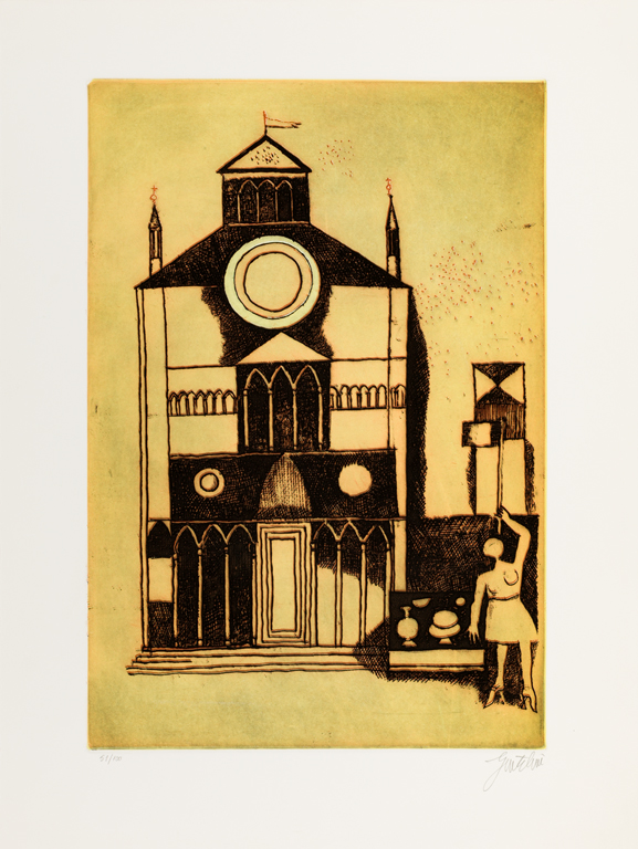 Cartella contenente 2 acqueforti, 2 litografie e testo di Dino Buzzati