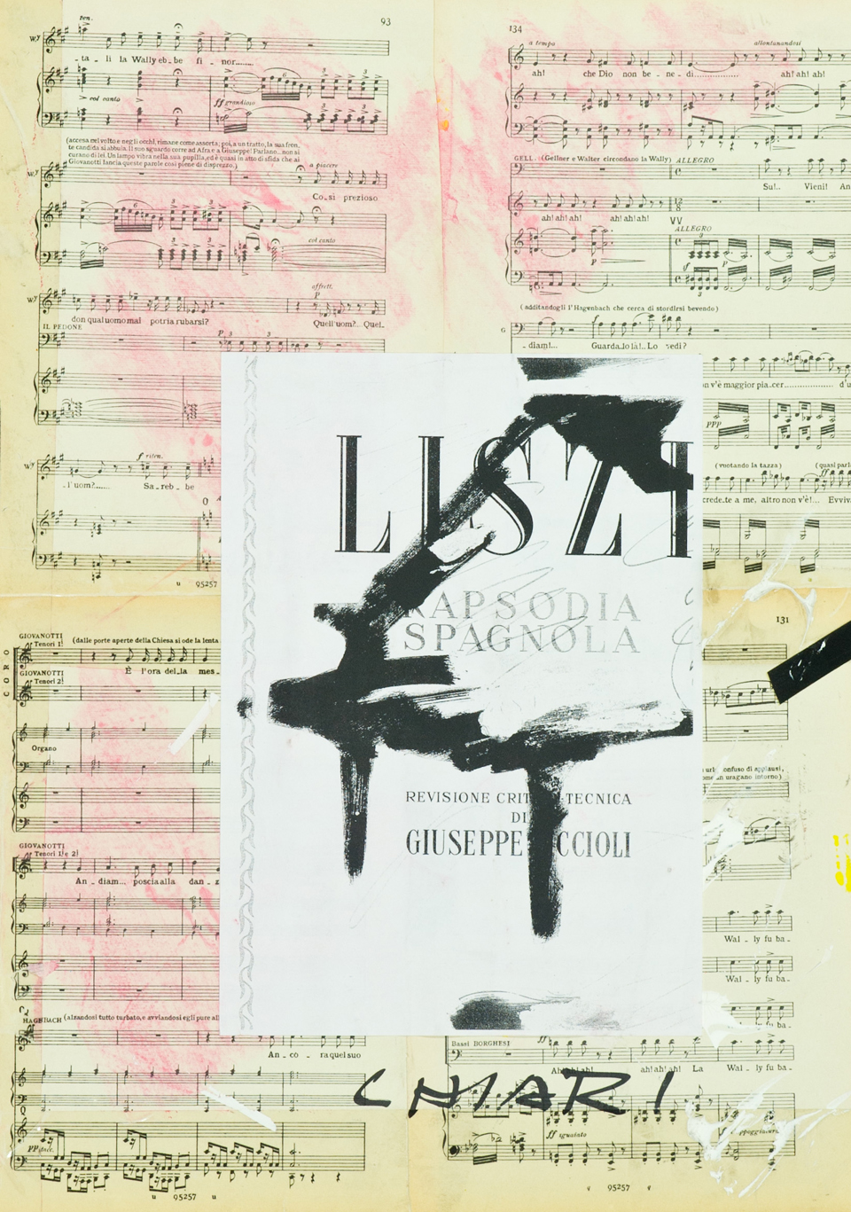 Giuseppe Chiari Rapsodia spagnola, 2000 Tecnica mista e collage su cartoncino di cm. 70x50 Firmato in basso a destra. Pubblicato su "Giuseppe Chiari, Musica e segno", ediz. Gli Ori - Armanda Gori Arte, disp. 1, pag. 146.