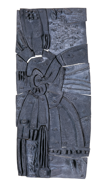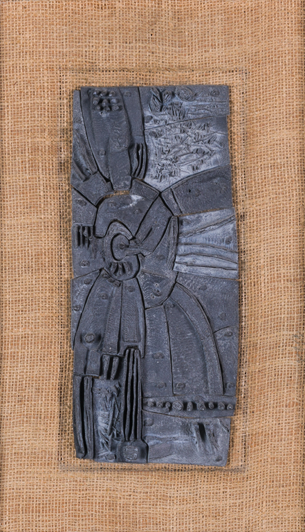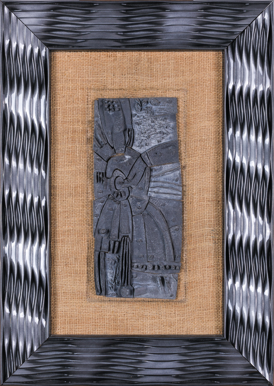 Scultura in piombo fuso su osso di seppia applicata su tela di juta cartonata