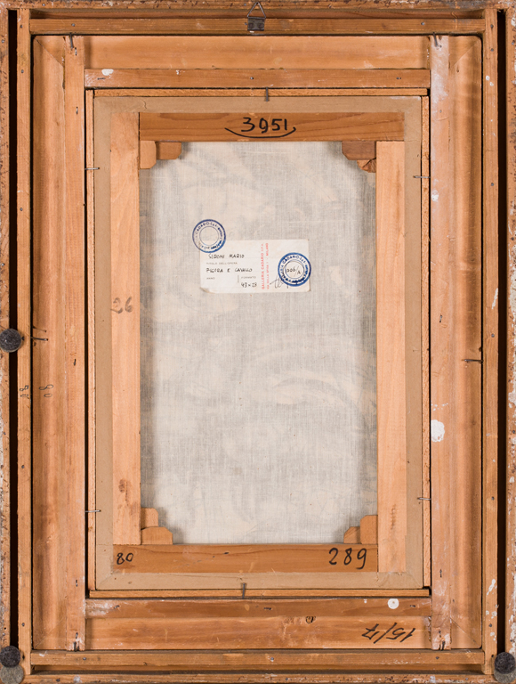 Etichetta, timbri e numero di repertorio della Galleria Cadario (MI) al retro