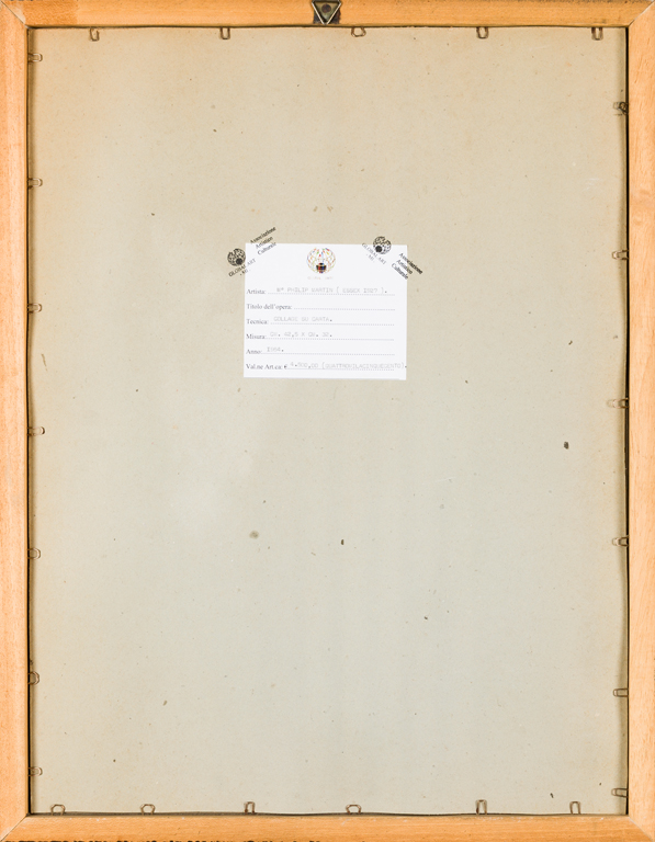 Etichetta e timbri della Galleria Global Art (MI) al retro del cartone protettivo