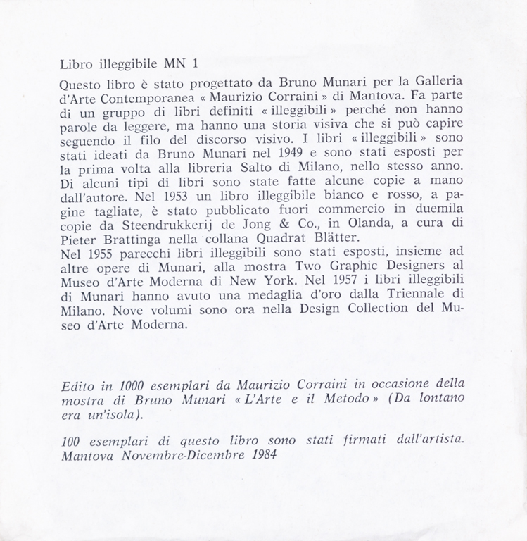 Edizione realizzata a Mantova nel Novembre - Dicembre 1984 in occasione della personale 'L'Arte e il Metodo. Da lontano era un'isola' tenutasi presso la Galleria Maurizio Corraini di Mantova