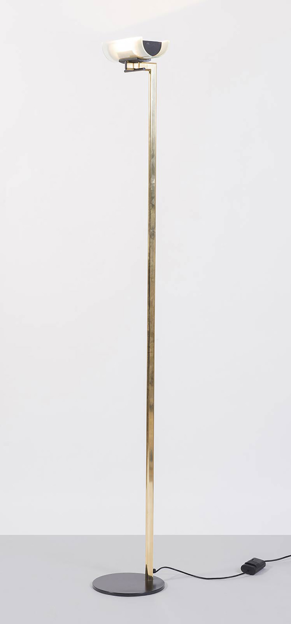 Lampada mod. Babila Terra, Produzione Nuova Lamperti, Anni ‘90. Struttura in ottone, base laccata nera, diffusore in vetro sabbiato, marchio all’interno del diffusore, monta luce alogena, H cm 190 - diametro alla base cm 25.5 (lievi usure)