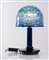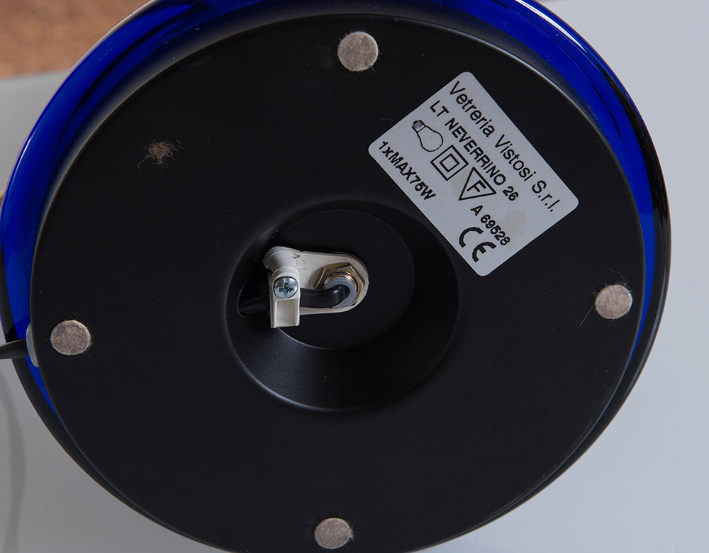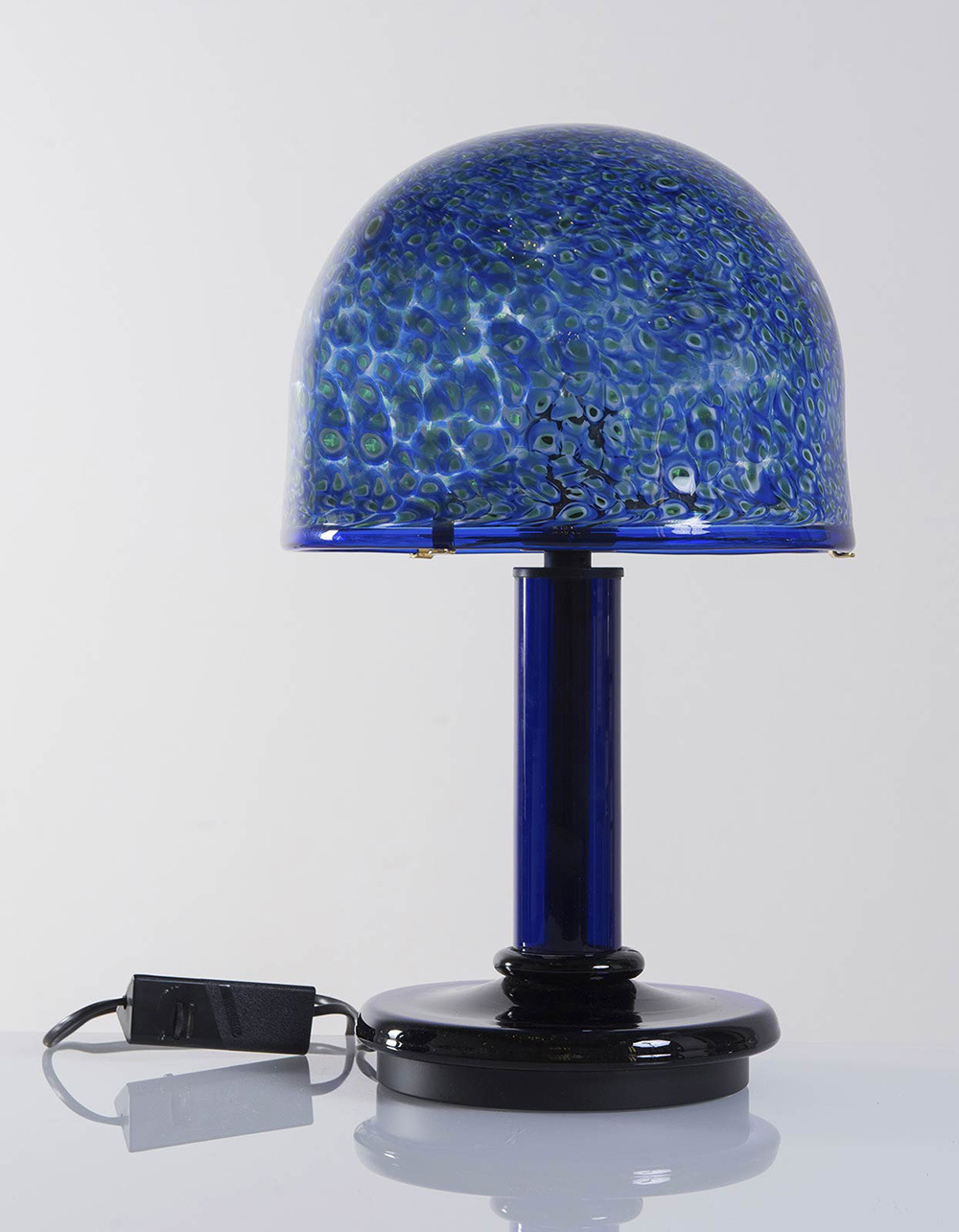 Luciano Vistosi (1931), “Neverrino”, Produzione Vetreria Vistosi, Anni '90. Lampada da tavolo in vetro di Murano con diffusore a murrine blu e verdi su fondo trasparente, fusto in vetro e parti in metallo, reca sotto la base etichetta Vetreria Vistosi srl - LT Neverrino 26, variatore di intensità luminosa, H cm 42, diametro cm 26