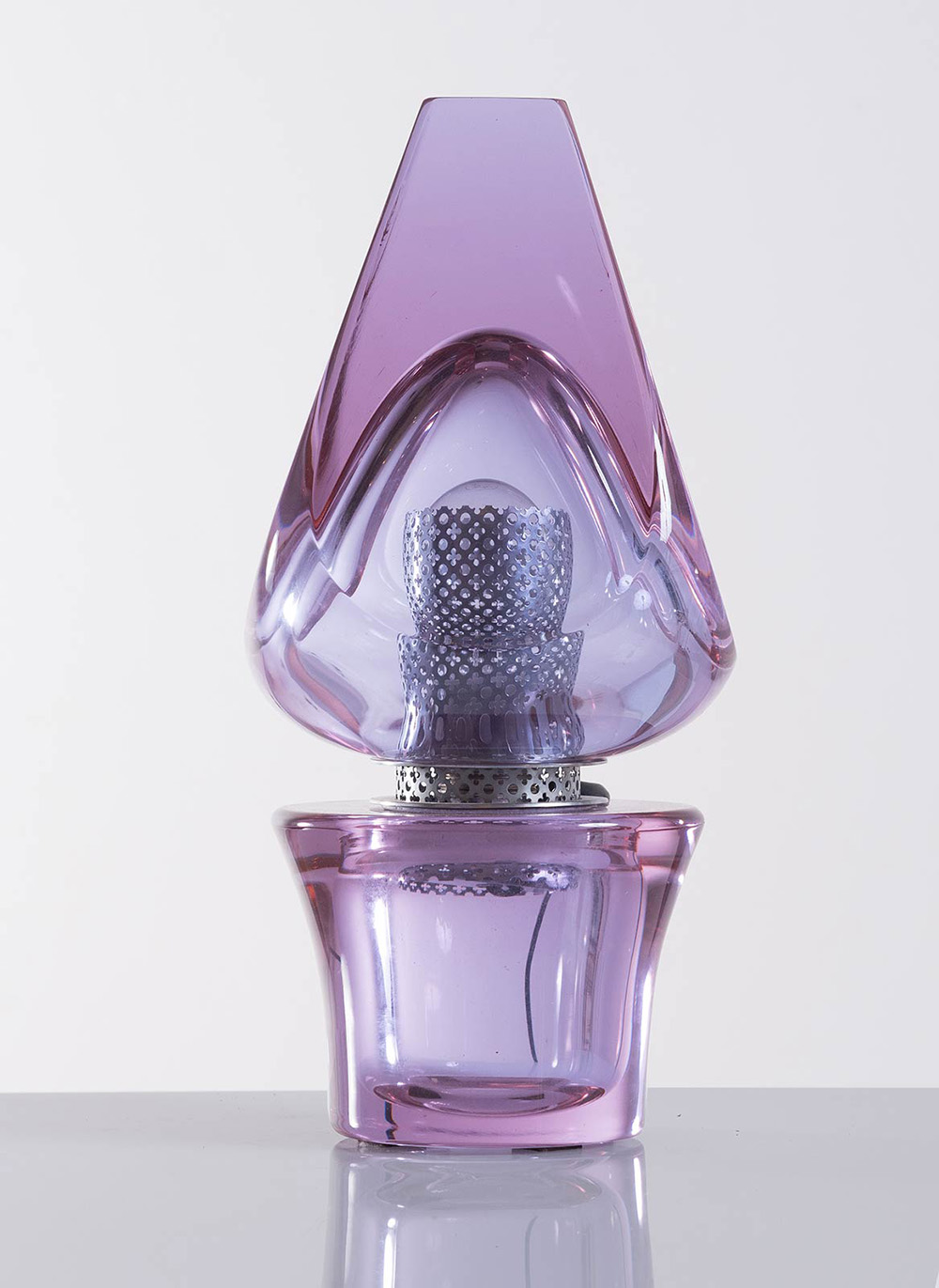 Flavio Poli (1900 - 1984), Lampada da tavolo mod. 14092, Produzione Seguso, Anni ‘60. Composta da due elementi in vetro di Murano colorato, struttura in metallo cromato, H cm 40 - diametro max cm 20
