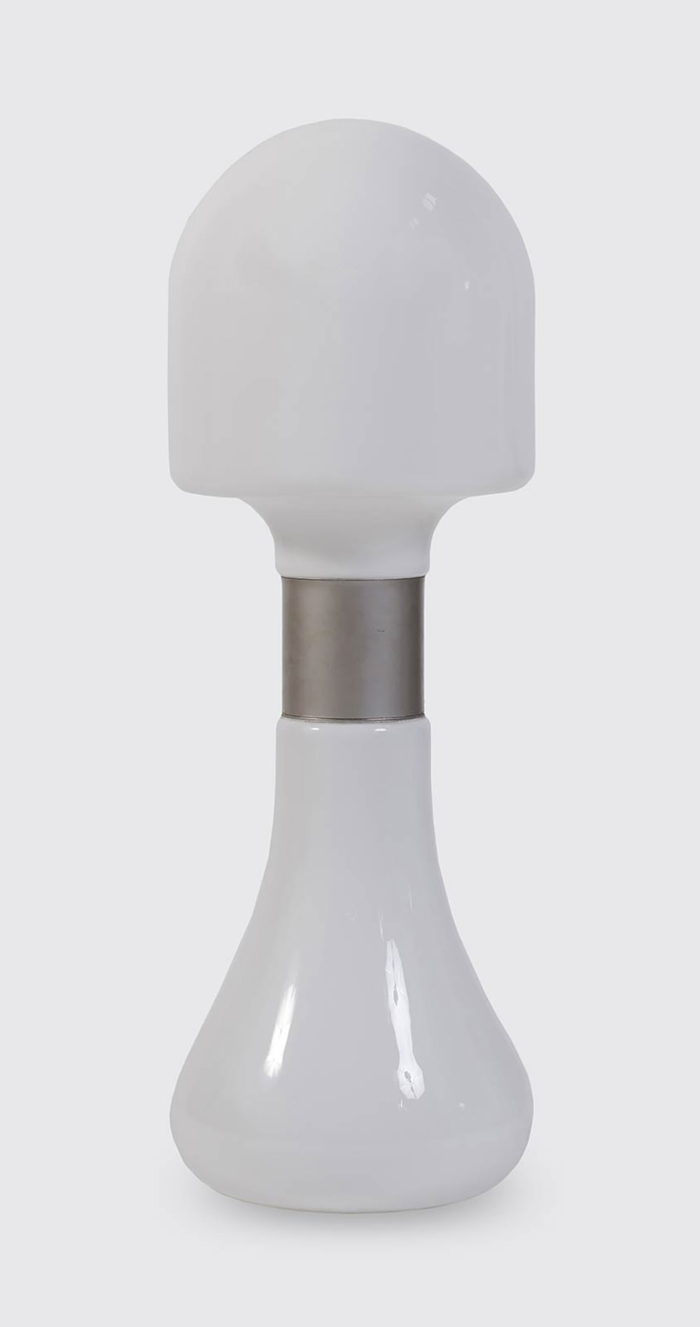 Carlo Nason (1935), Lampada da terra, Produzione Mazzega, Anni ‘70. Lampada ‘a fungo’ composta da due elementi in vetro, fascia centrale in metallo argentato, doppia accensione, H cm 100 - diametro cm 30 (lievi usure)