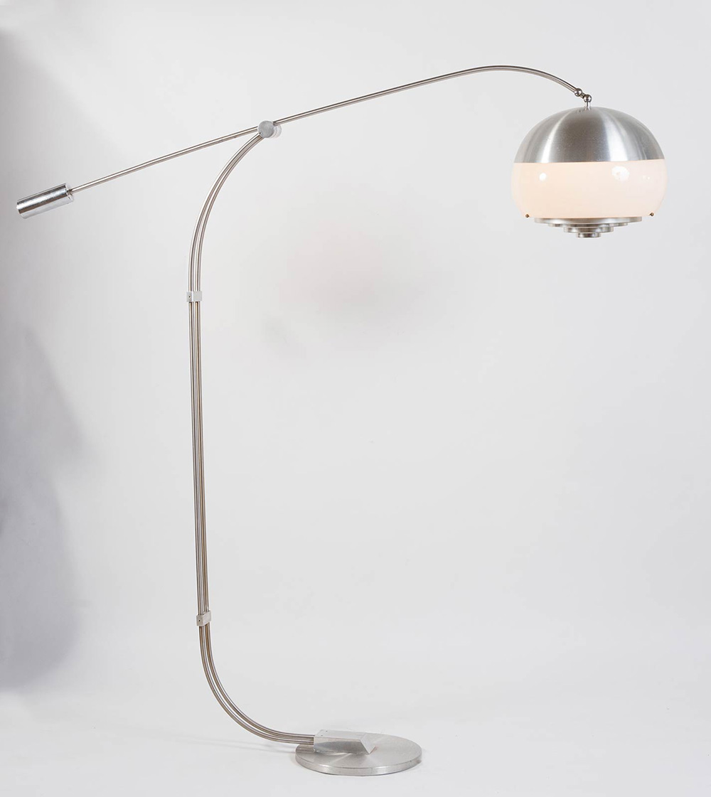 Lampada ad arco “Giraffa”, Produzione Fersan, Anni ‘70. Struttura in acciaio con elemento diffusore in alluminio e plexiglas bianco, monta una lampadina centrale, H max cm 200 - ingombro cm 190 (lievi usure) Bibliografia: Pubblicità da Rivista dell’epoca - “Fersan – Luci e forme per la casa”, art. 243.
