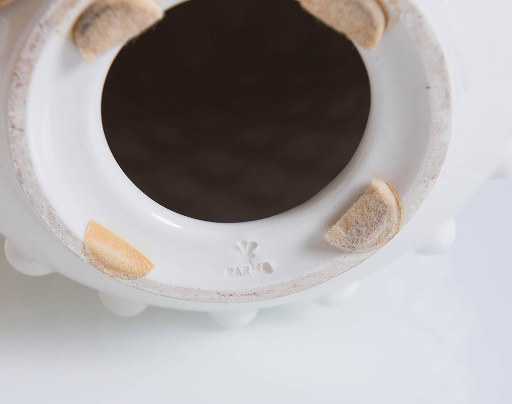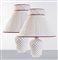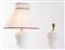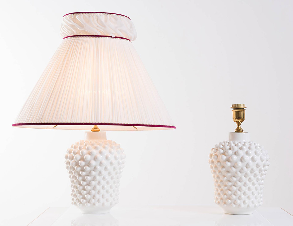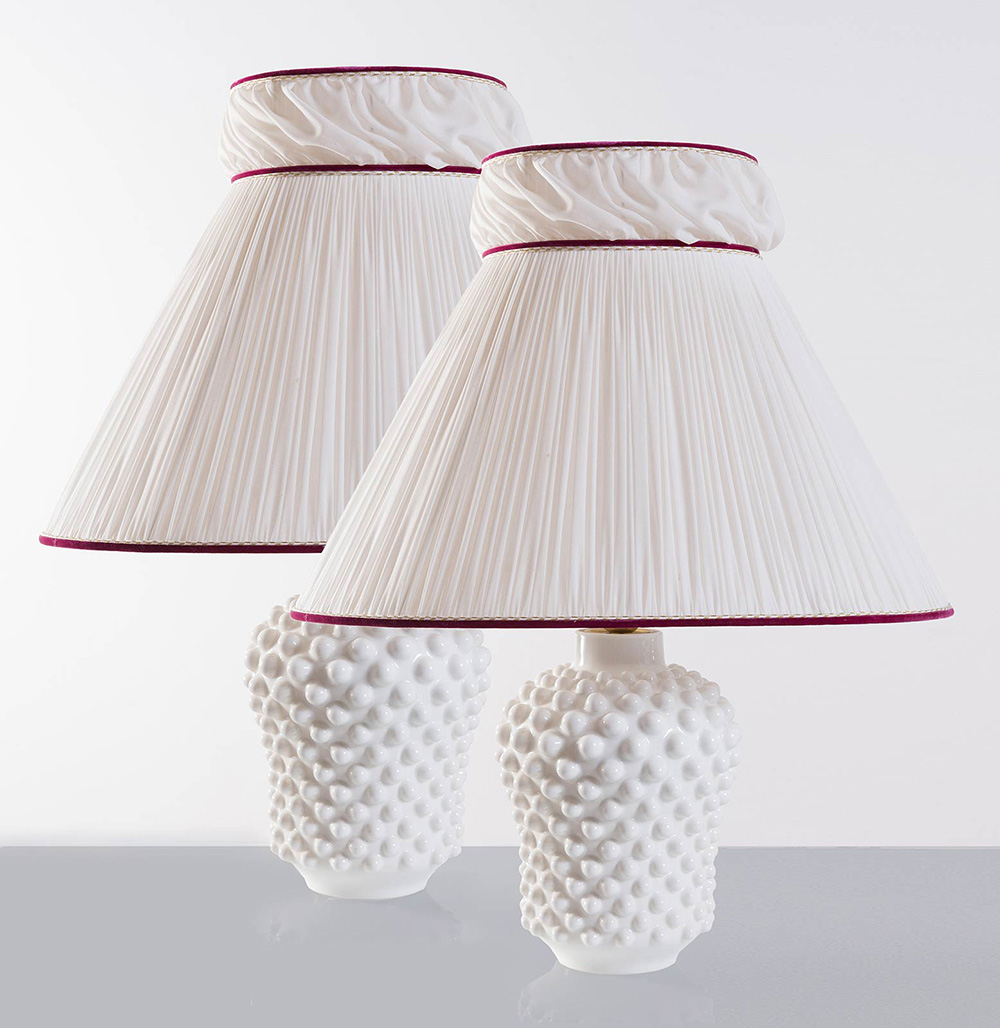 Coppia di lampade da tavolo in ceramica, Manifattura La Farnesiana, Parma - Anni ‘70. A foggia di pigna bianca, recano alla base marchio della manifattura, cappello in tessuto plissettato bordato in rosso, H Tot. cm 70 - H della base in ceramica cm 30 (difetti)