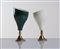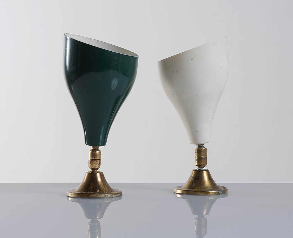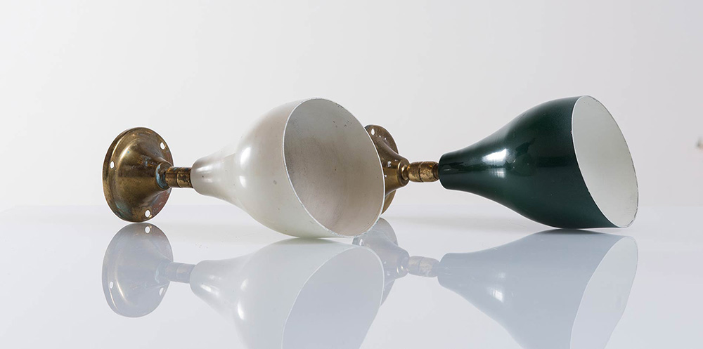 Coppia di spot, Produzione Italiana, Anni ‘50. Diffusore in alluminio laccato verde e avorio, attacco e snodo in ottone, H cm 21, diametro cm 10 (difetti)