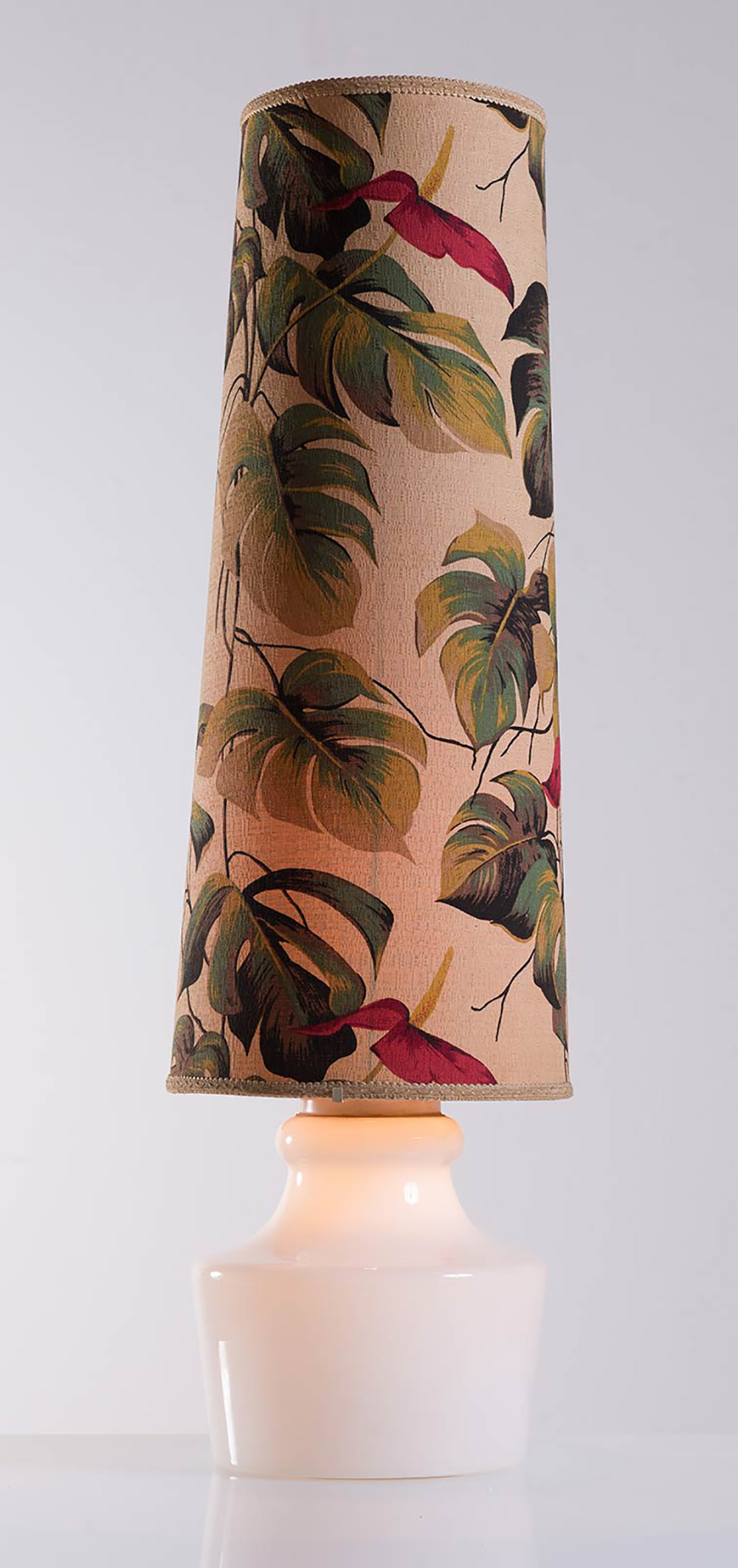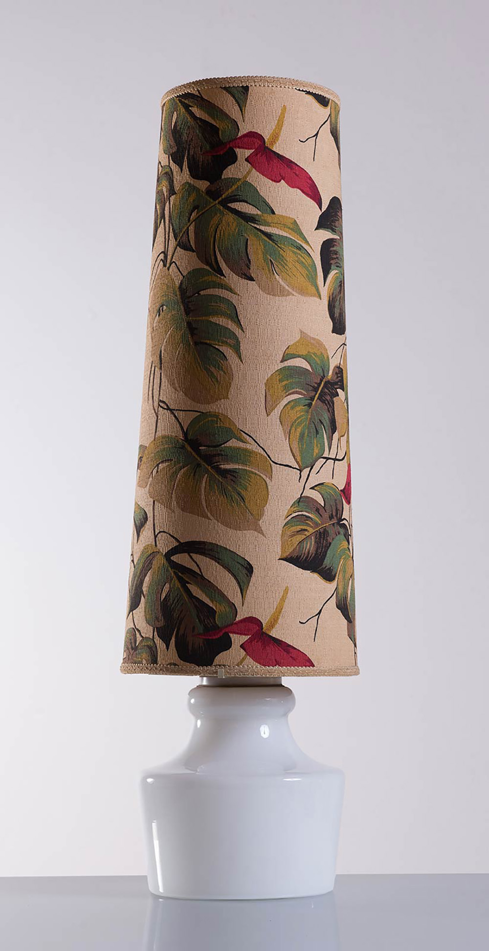 Lampada da tavolo con cappello a decori floreali, Produzione Italiana, Anni ‘70. Base in vetro bianco latte e cappello in tessuto con montatura in metallo, doppia accensione, H cm 93 - diametro cm 25 (usure)