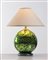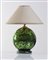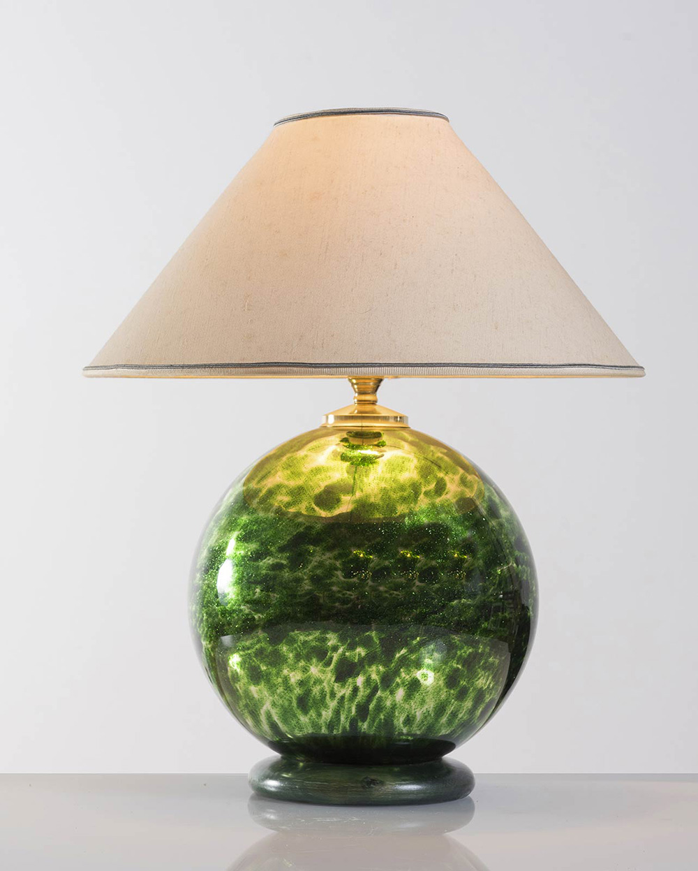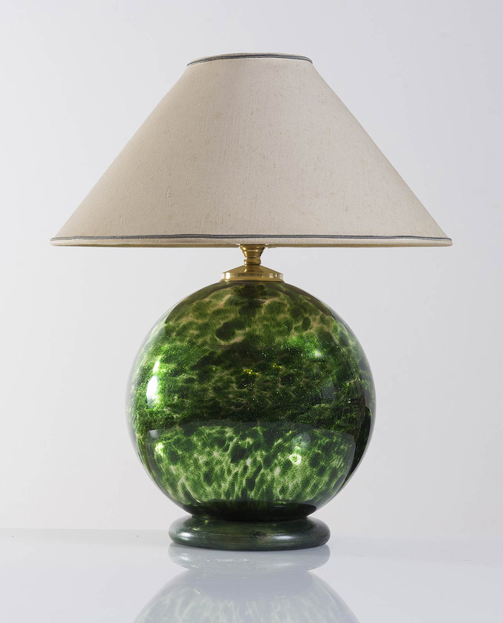 Lampada da tavolo, Produzione Italiana, Anni ‘80. Corpo sferico in vetro lavorato a macchie verdi su fondo a specchio, base in legno, cappello in tessuto, H cm 48 – diametro del cappello cm 40 - diametro alla base cm 16 (usure e difetti)