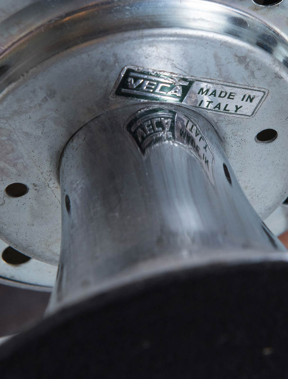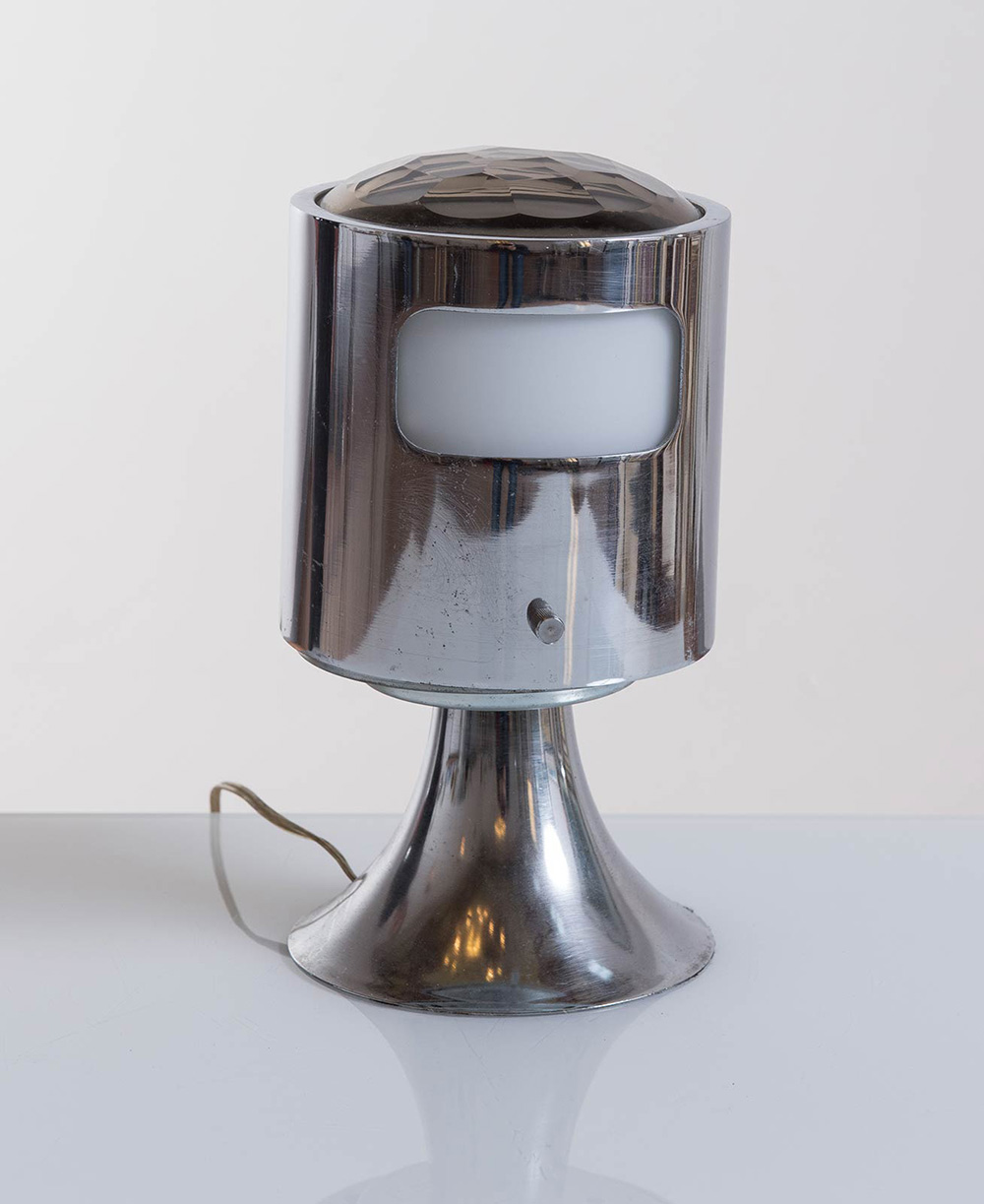 Lampada da tavolo, Produzione Veca, Anni ‘70. Struttura in metallo cromato con diffusore in vetro opalino e parte alta in vetro sfaccettato fumé, reca etichetta originale VECA-Made in Italy, H cm 22 - diametro cm 13 (usure)