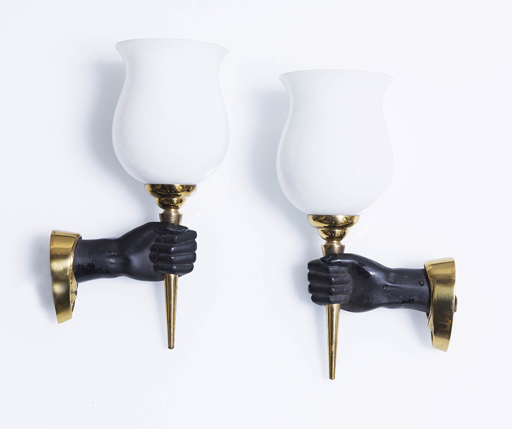 Coppia di appliques a foggia di mani, Produzione Francese, Anni ‘70. Struttura in bronzo nero e dorato, diffusore in vetro opalino bianco. H cm 28x17x10.5 (lievi usure)