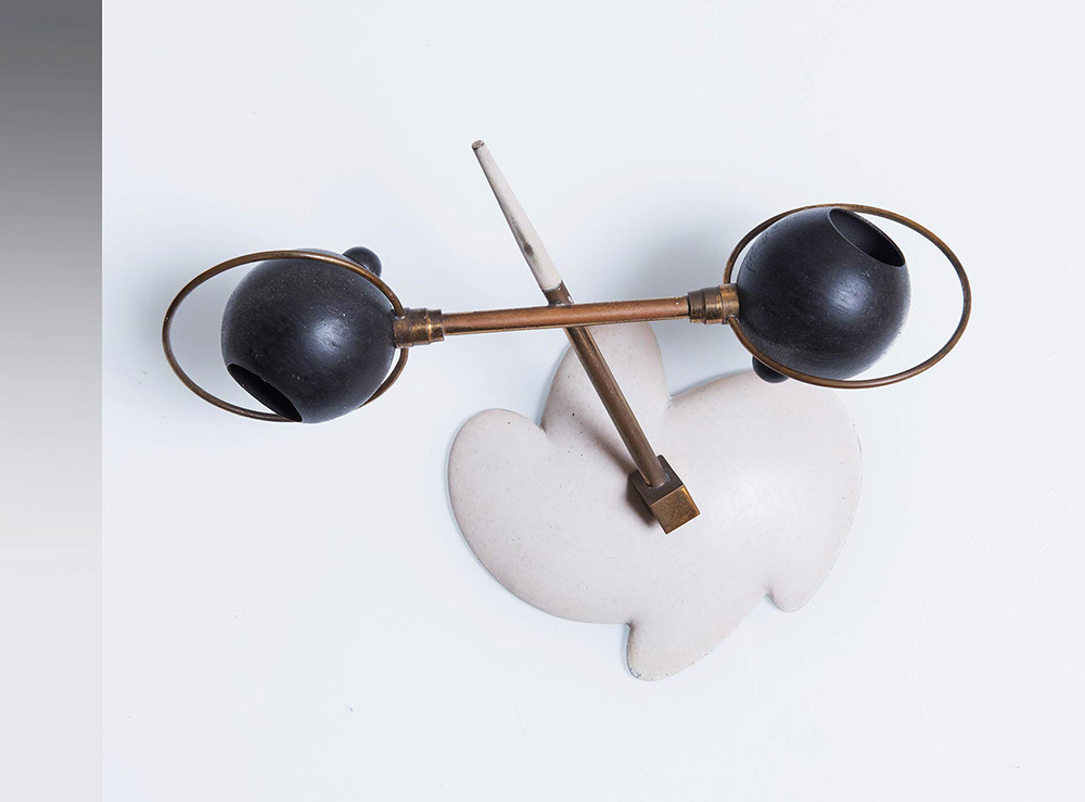 Curiosa applique a due luci, Produzione Europea, Anni ‘50. Base in metallo laccato bianco, sfere laccate nere e struttura in ottone, cm 28.5x12 (usure e difetti)