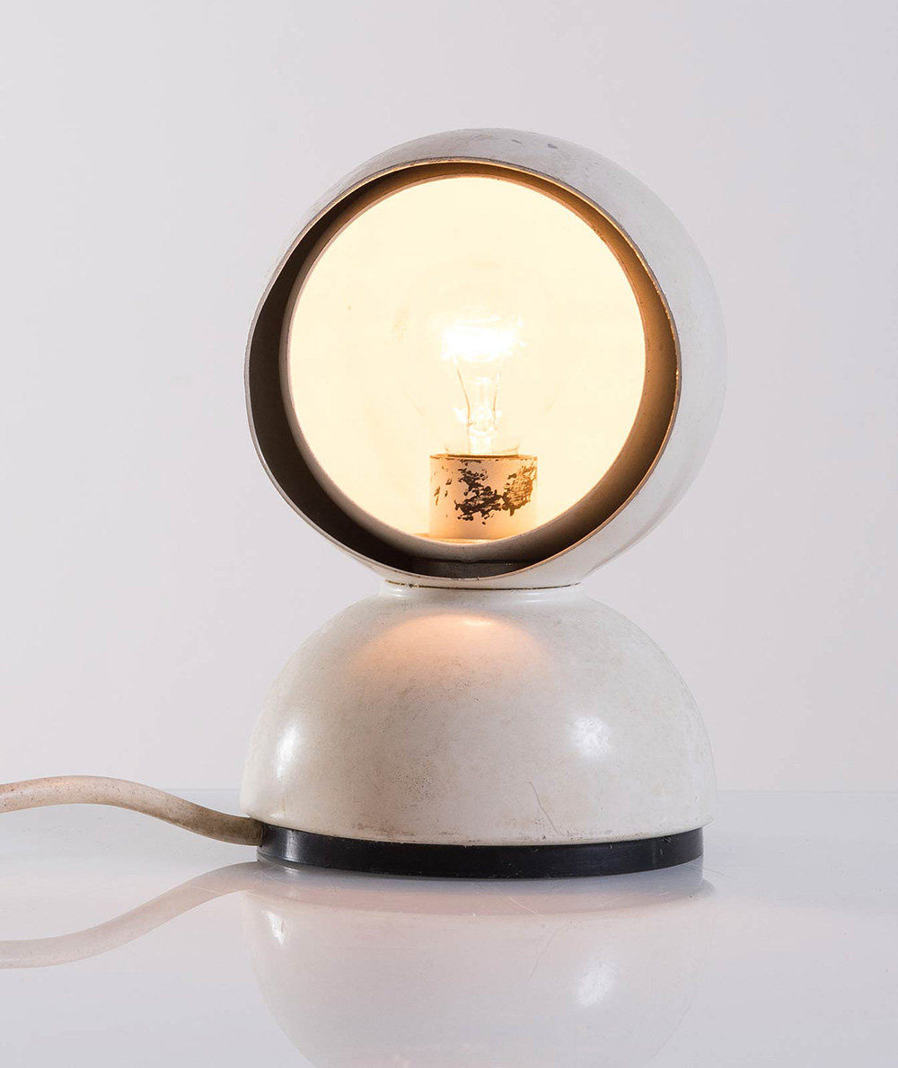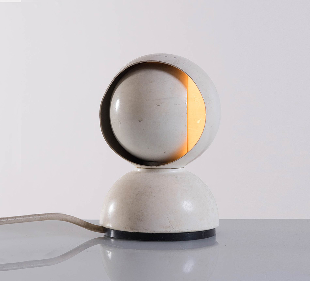 Vico Magistretti (1920 – 2006), “Eclisse”, Studio Artemide, Milano – Anni ‘60. Lampada da comodino con struttura in metallo laccato bianco, calotta girevole, marchio e dati tecnici impressi sotto la base in materiale plastico nero, H cm 18 (usure – difetti)