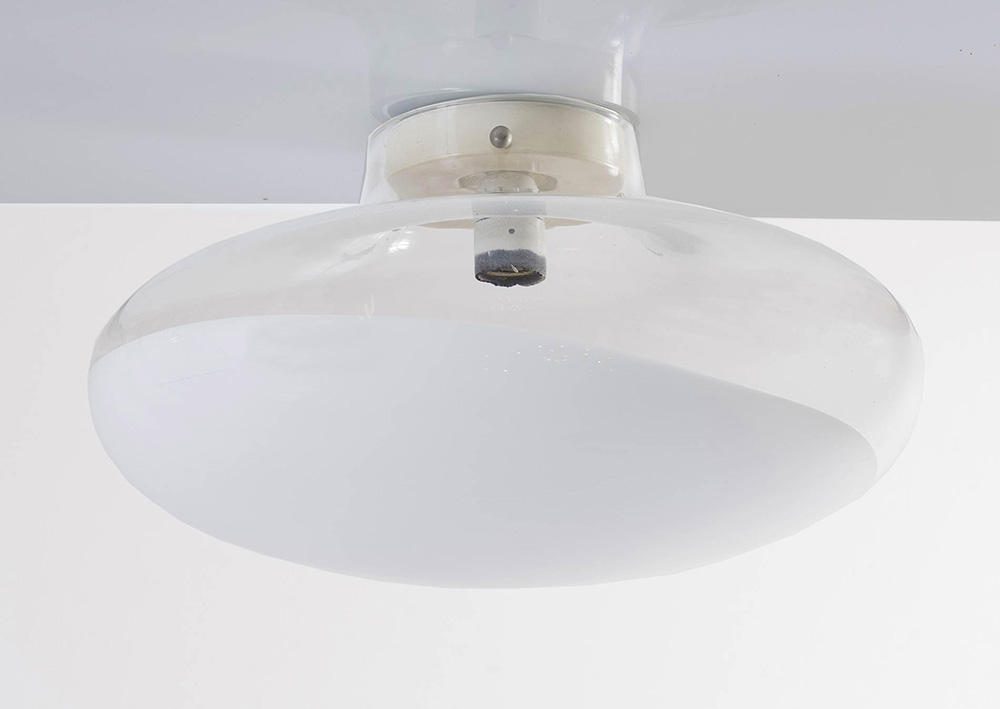 Roberto Pamio (XX sec.), “Gill”, Produzione Leucos, Anni '60. Plafoniera in vetro soffiato trasparente e bianco, H cm 26 - diametro cm 44