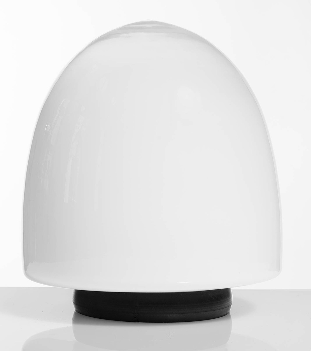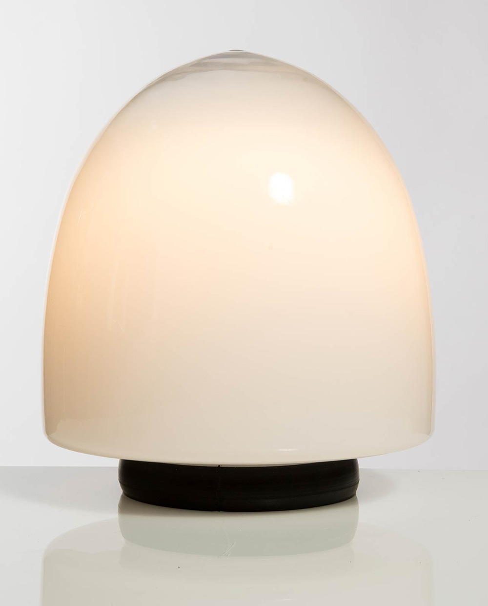 Giusto Toso (1939), ”Ebe”, Produzione Leucos, Anni ‘70. Lampada da tavolo in vetro lattimo e trasparente, reca etichetta originale, H cm 30, diametro cm 25