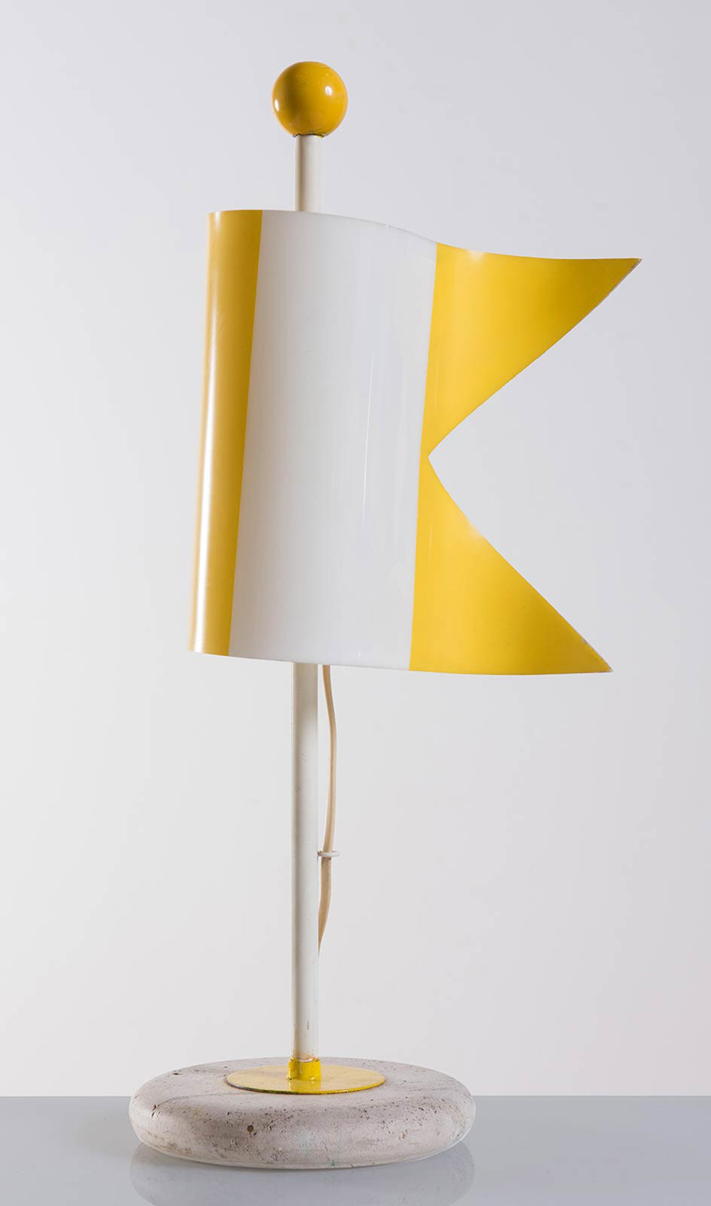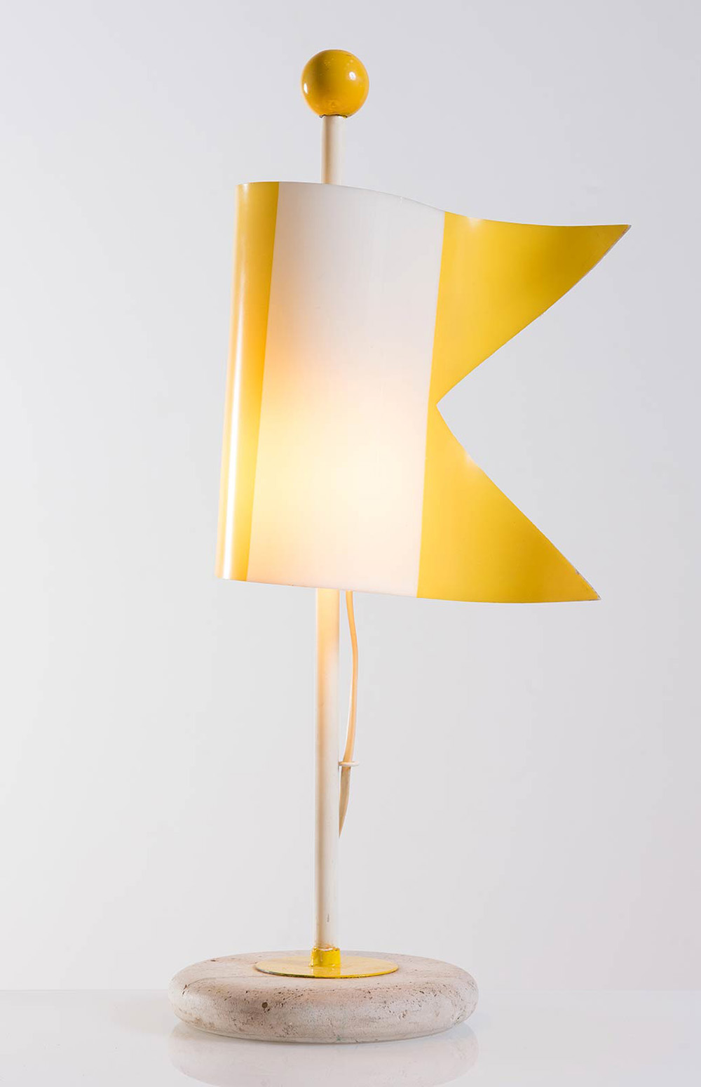 Lampada da tavolo, “Bandiera gialla”, Produzione Italiana, Anni ‘70. Fusto in metallo laccato bianco e giallo, poggiante su base tonda in travertino, diffusore in plexiglas a bande gialle e bianche, H cm 55x22x17 (usure)