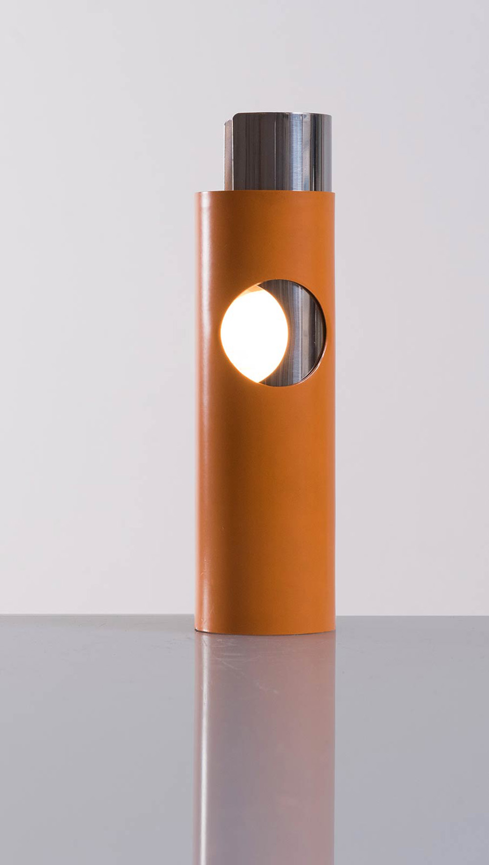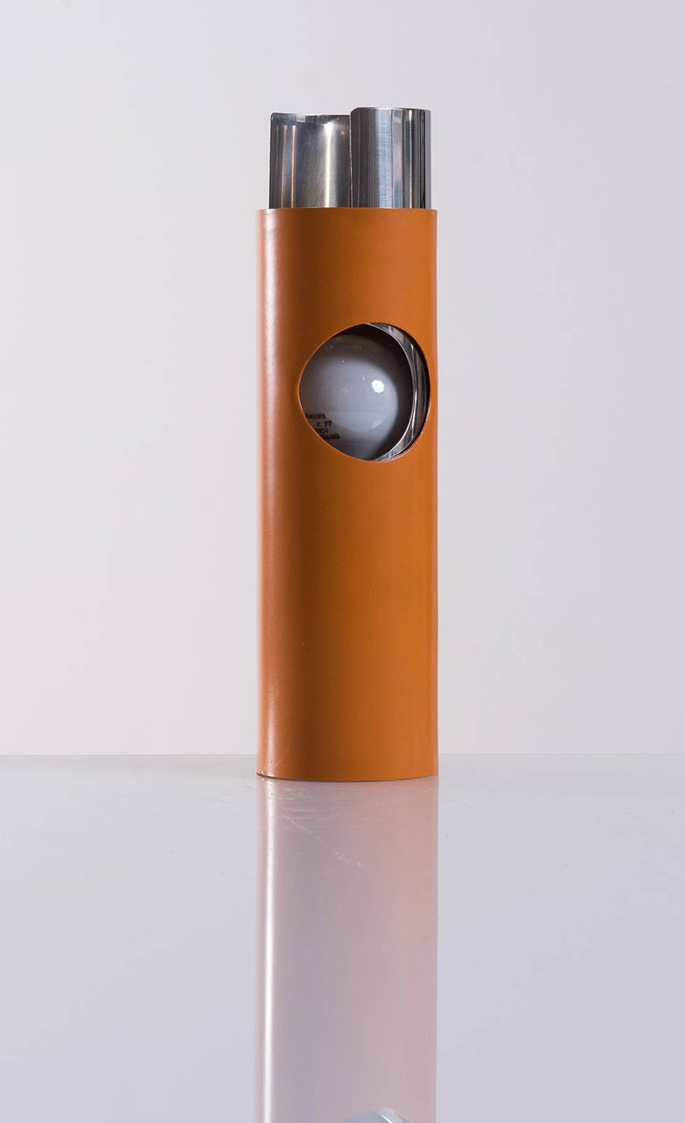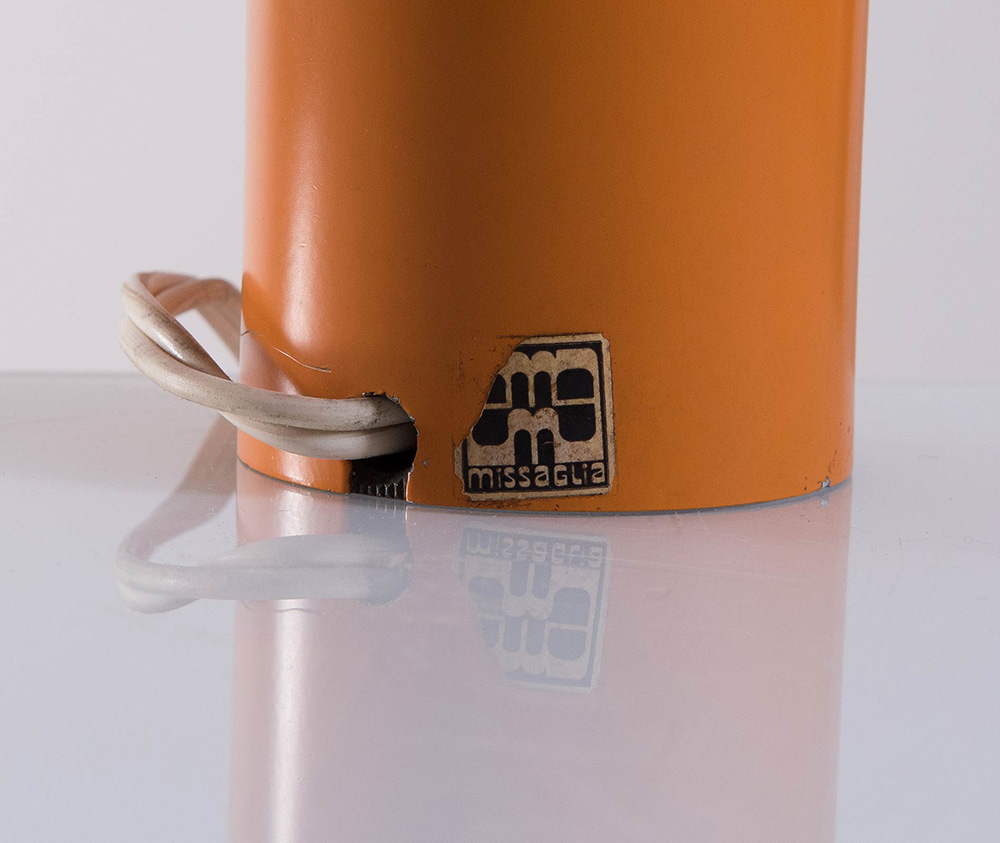 Gaetano Missaglia (XX-XXI sec.), Mod. “Privacy”, Produzione Missaglia, Fine Anni ‘60. Lampada da tavolo con struttura cilindrica in metallo laccato arancione e cromo, luce regolabile, reca etichetta originale Missaglia, H cm 32, diametro cm 6 (lievi usure) Bibliografia: Pubblicità da Rivista dell’epoca “Interni”- 1968.