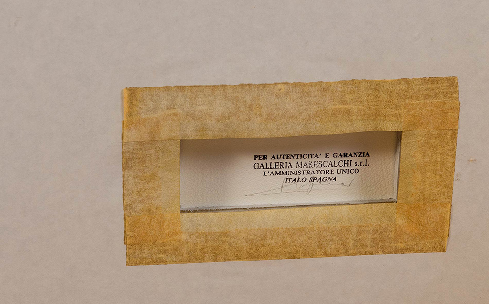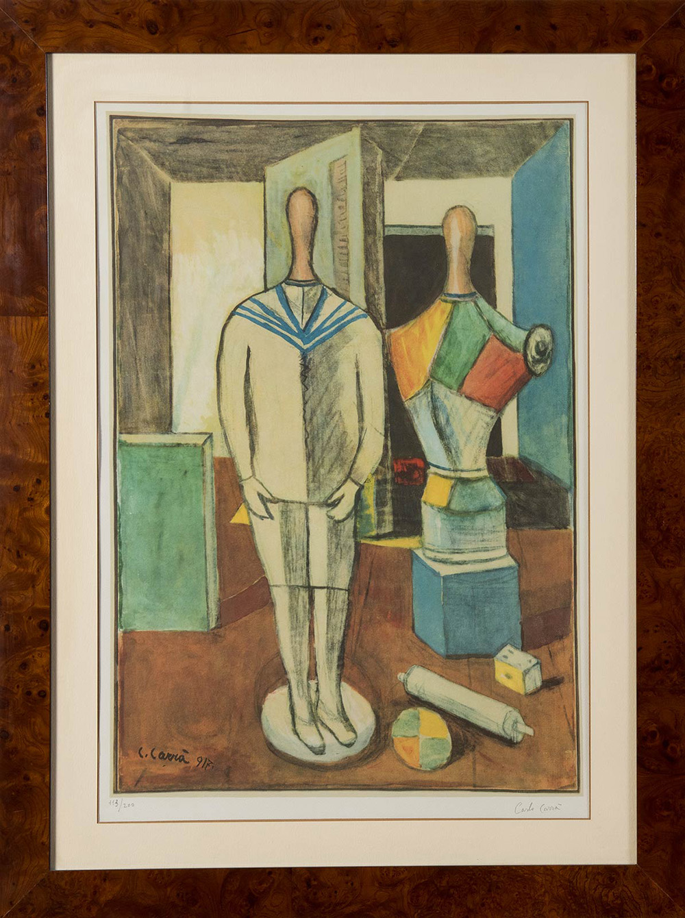 Carlo Carrà (Quargneto, 1881-Milano, 1966), “Madre e figlio”, Anni ‘50. Fotolitografia a colori, firmata in basso a destra Carlo Carrà, numero di tiratura in basso a sinistra 113/200, Lastra 68.5x47 Reca al retro etichetta della Galleria D’Arte Marescalchi