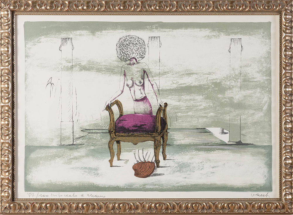 Sergio Vacchi (Castenaso, 1925 - Siena, 2016), “Piscine lustrali”. Litografia ritoccata a mano, firmata in basso a destra Vacchi, numero di tiratura in basso a sinistra 77/100, H cm 44.5x64.5