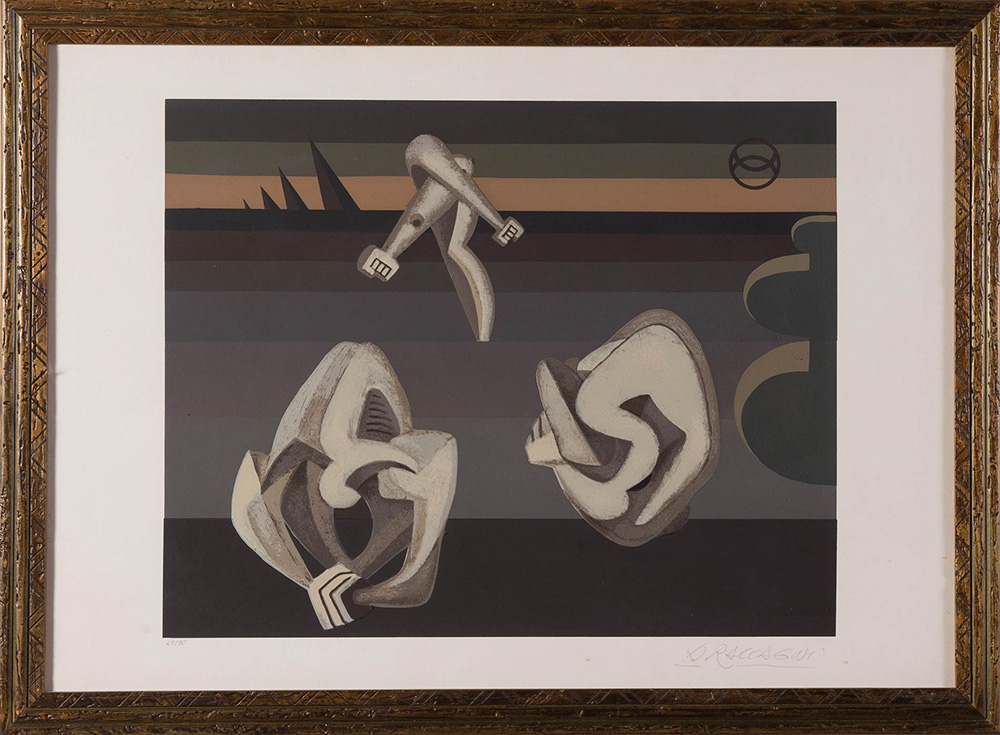 Andrea Raccagni (Imola, 1921 - 2005 ), “La piana del silenzio”. Serigrafia a colori su carta, firmata in basso a destra A. Raccagni, numero di tiratura in basso a sinistra 49/90, Lastra H cm 41x51