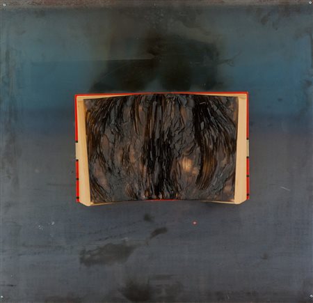 Bernard Aubertin Livre Brulè, 2010 Libro bruciato su lastra di metallo, cm 70x74, in teca di plexiglass Sul verso: firma e data. Foto che ritraggono l'Artista con l'Opera.