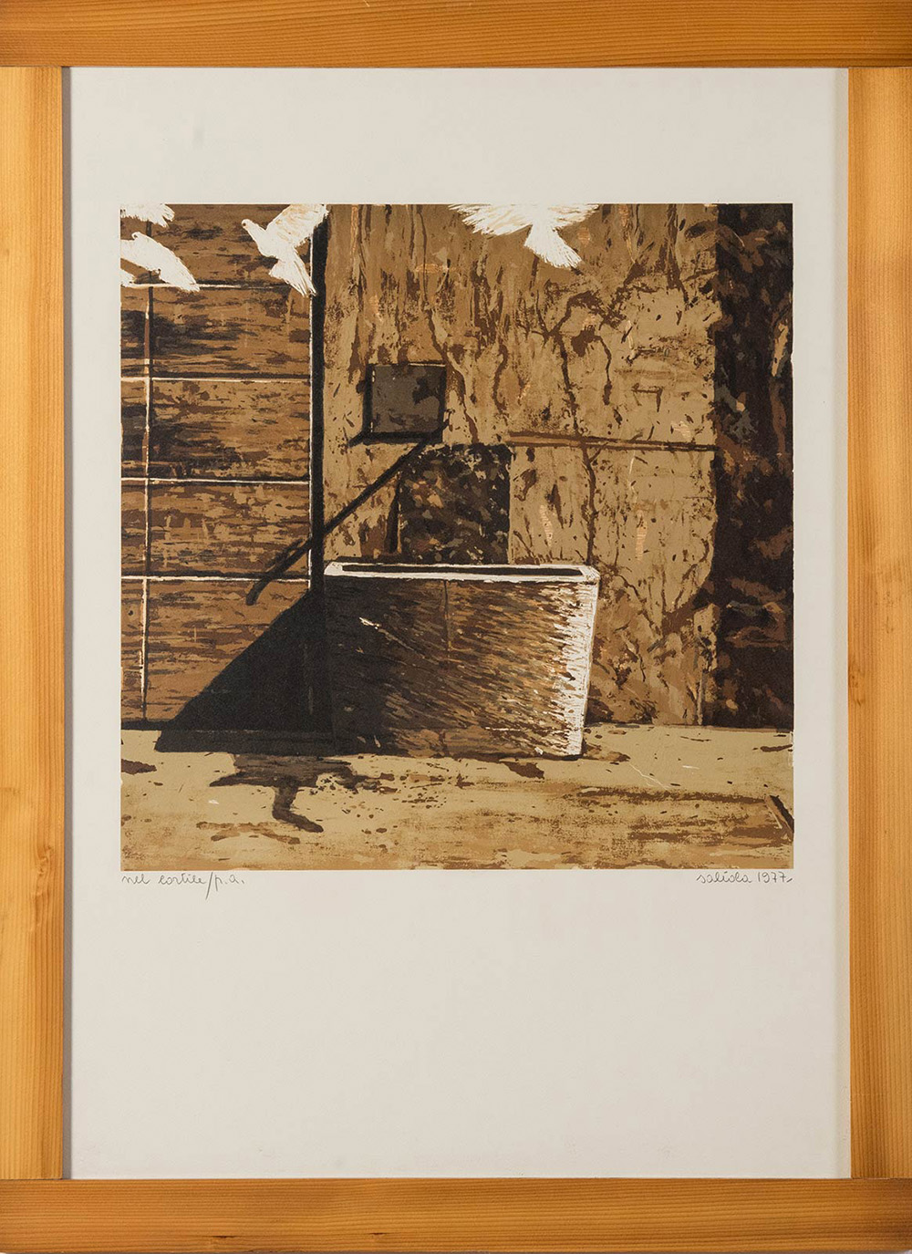 Antonio Saliola (Bologna, 1939), “Nel Cortile”, 1977. Litografia a colori su carta, firmata e datata in basso a destra Saliola 1977, titolo e numero di tiratura in basso a sinistra ‘Nel Cortile’/P.A., Lastra H cm 41x41.5