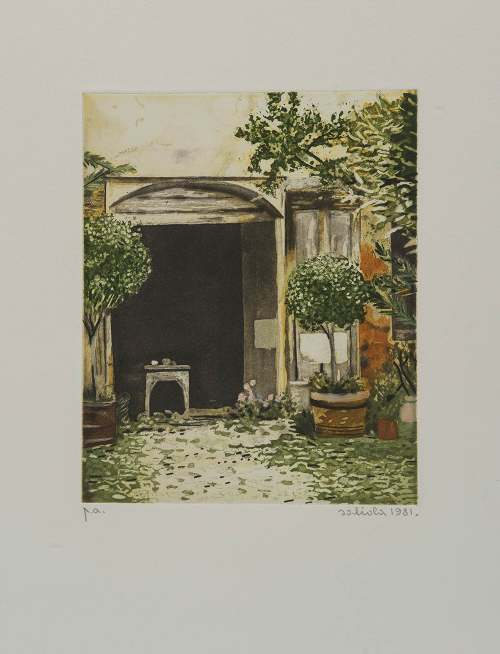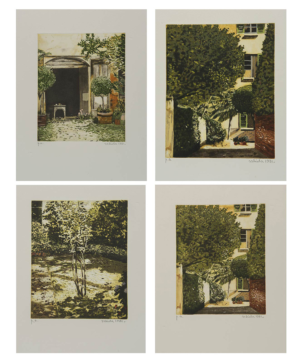 Antonio Saliola (Bologna, 1939), Lotto di quattro acqueforti “Cortili”. Acquaforti ceramolli a sei colori su carta, firmate e datate in basso a destra Saliola 1981, esemplari P.A., H cm 24x20