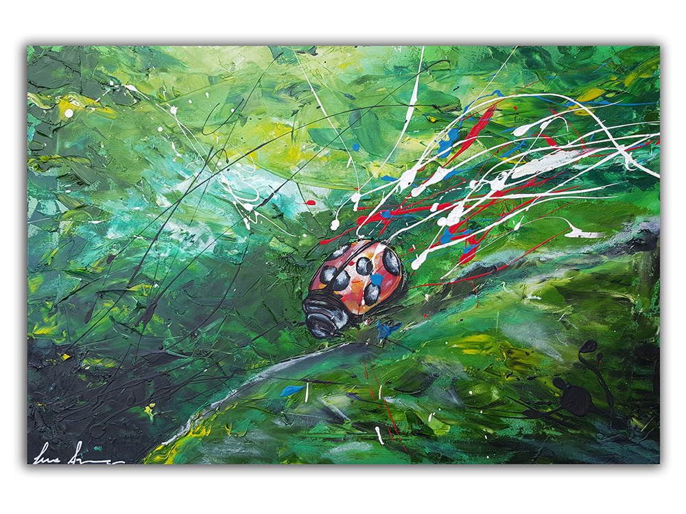 Luca Azzurro, Coccinella 2, 2015 Acrilico olio spray su tela, 40cm x 60cm. Autentica su foto dell'artista