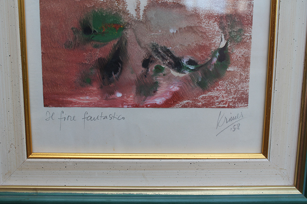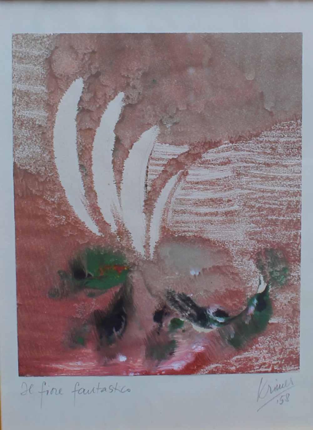 Krimer , Il fiore fantastico, 1958 Mista su carta, 22cm x 18cm. Firmato e datato fronte opera