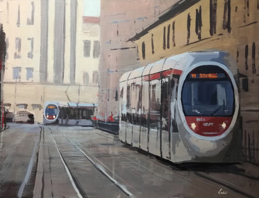 Lot 63 | Claudio Cionini, Tramvia a Firenze, 2018 Mista su cartone, 60cm x 80cm....