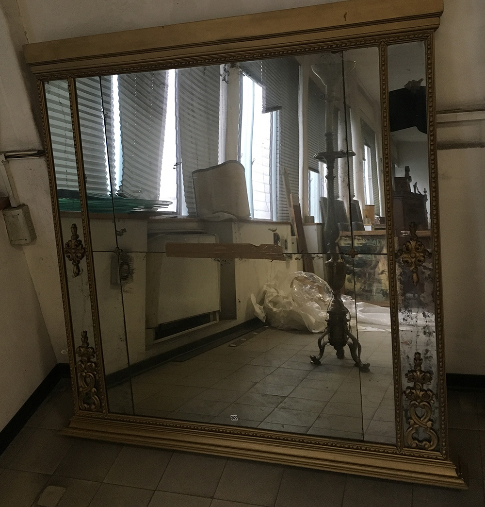 Caminiera in legno dorato decorata con inserti in legno intagliato a volute (cm 134x140) (difetti e restauri)