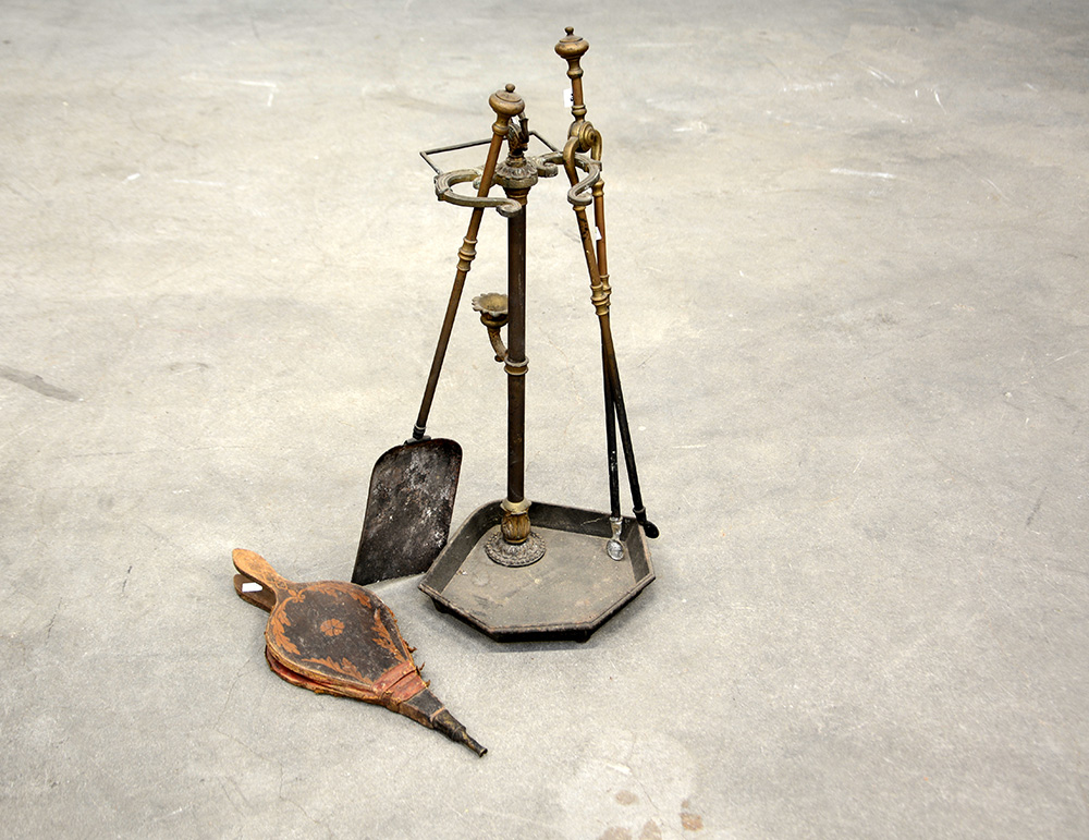 Base porta attrezzi in metallo con alcuni attrezzi da camino (difetti)
