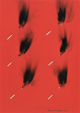 Bernard Aubertin Papier rouge brulè, 2009 Fiammiferi su cartoncino bruciato, cm. 50x36 applicato su tela, cm. 70x50 Firma e data in basso a destra. Autentica dell'Archivio "Nordest S.r.l.", Seregno, su foto, con firma dell'Artista e Archivio n° 1616.
