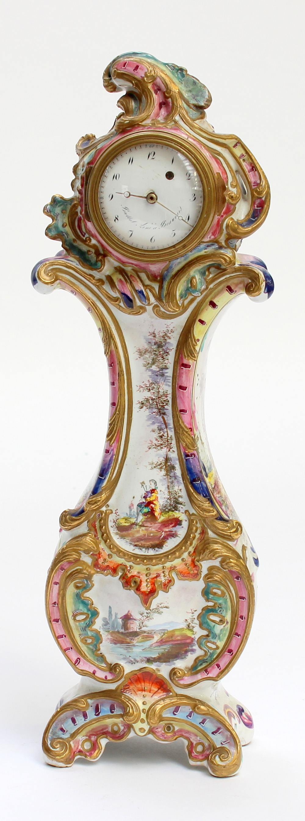 Orologio da tavolo in ceramica policroma, movimento con carica giornalliera (h. cm 30) (difetti e sostituzioni)